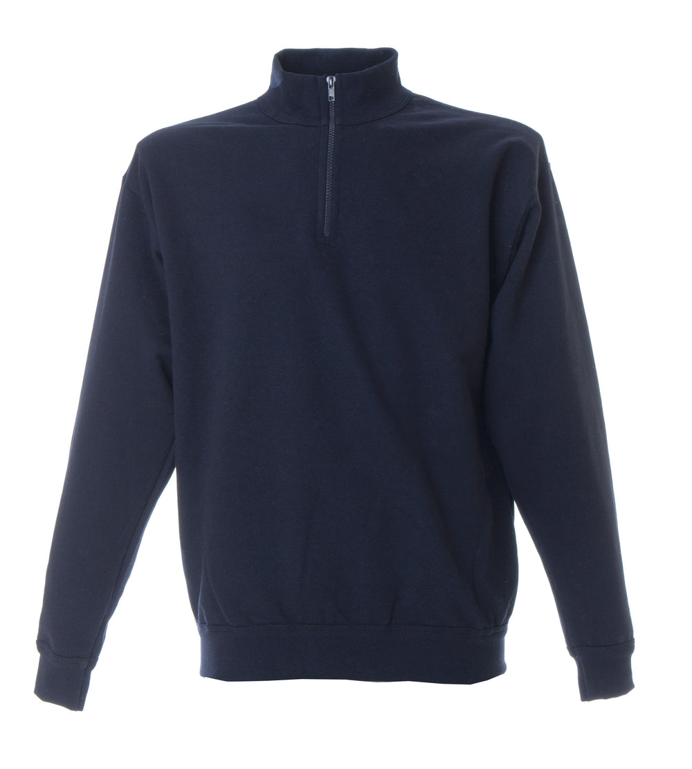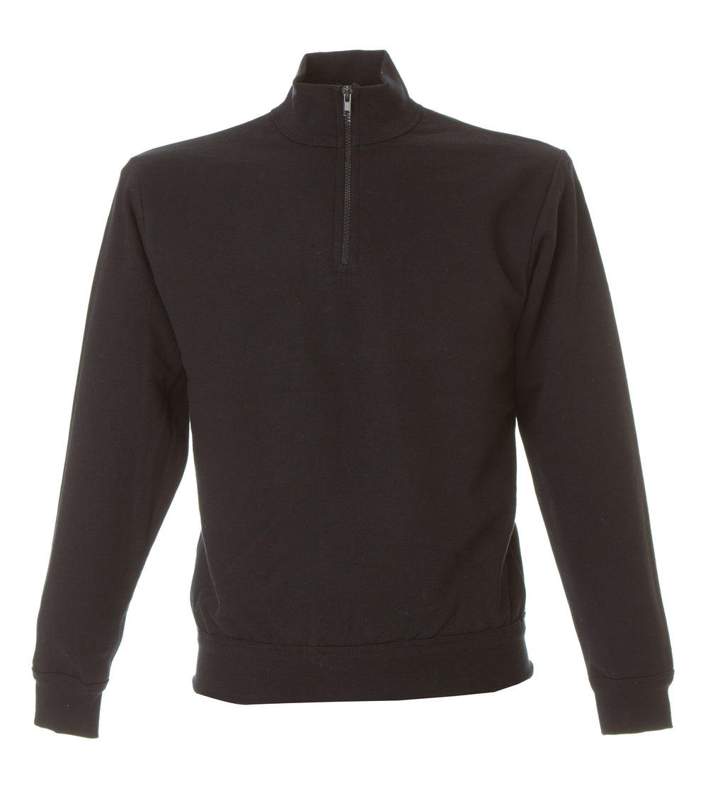 Felpa 80% cotone - 20% poliestere in french terry - Non felpata internamente, collo a lupetto in felpa, zip corta, polsini e fondo maglia in costina elasticizzata, nastro di rinforzo interno collo, cuciture ribattute.