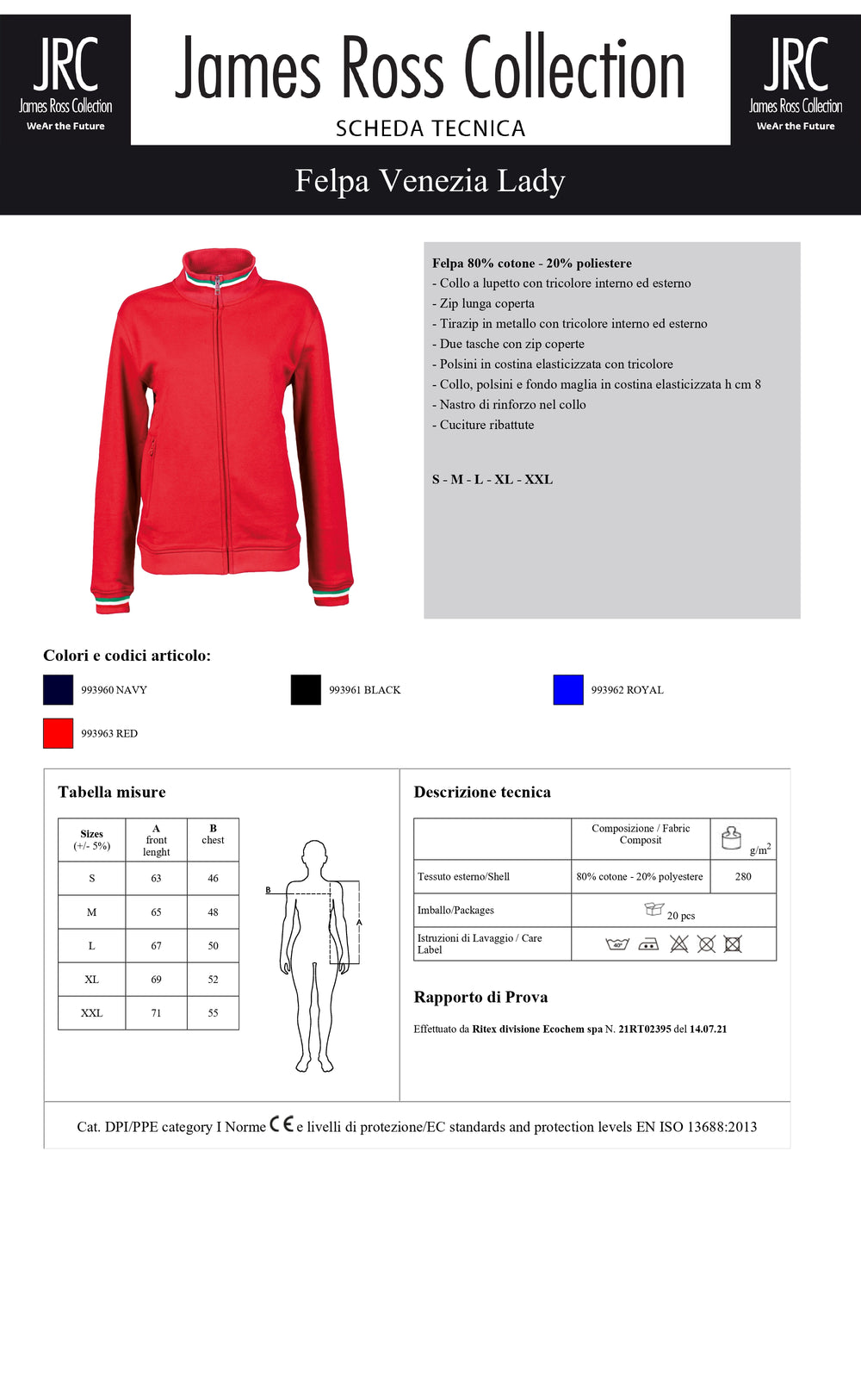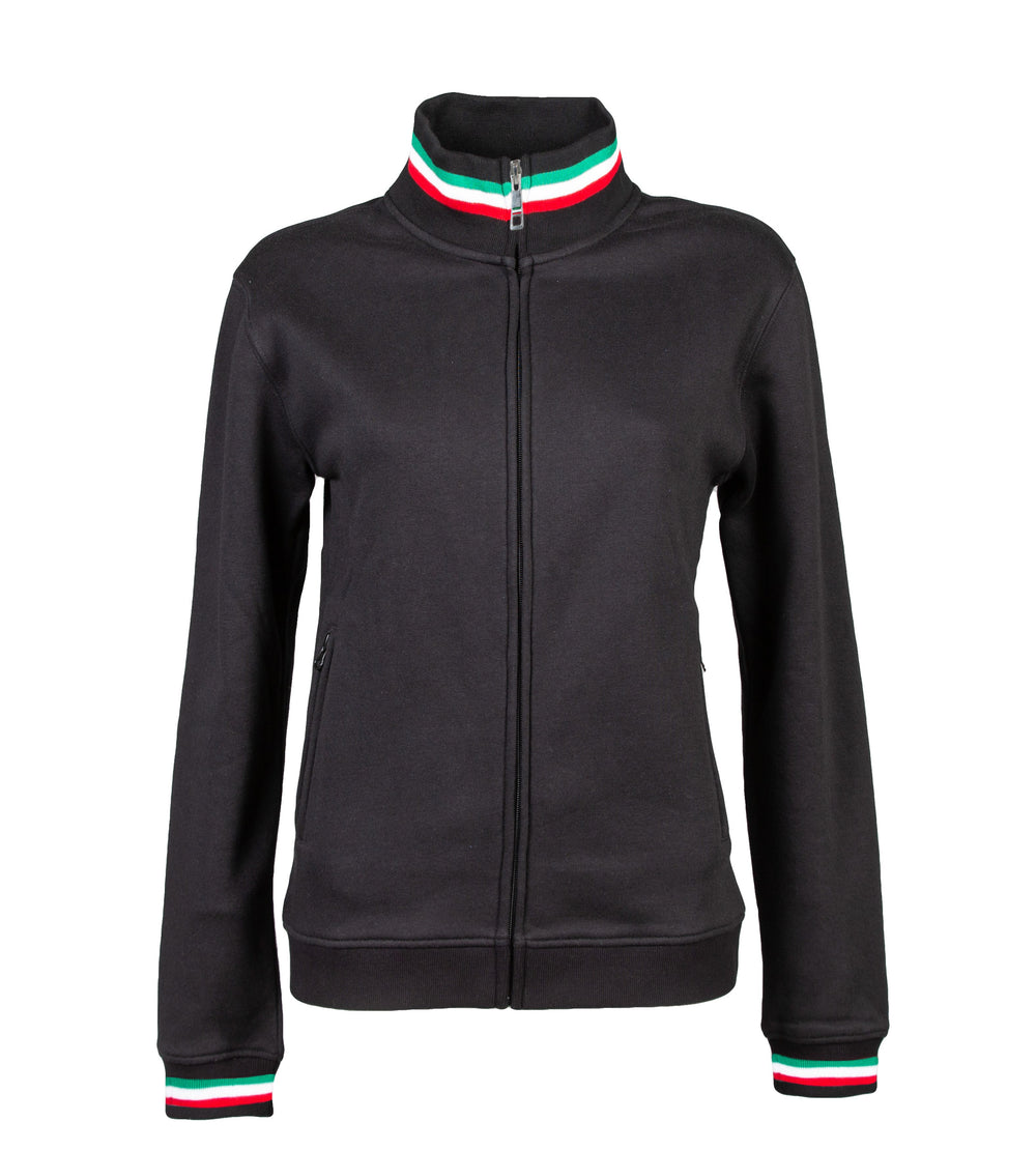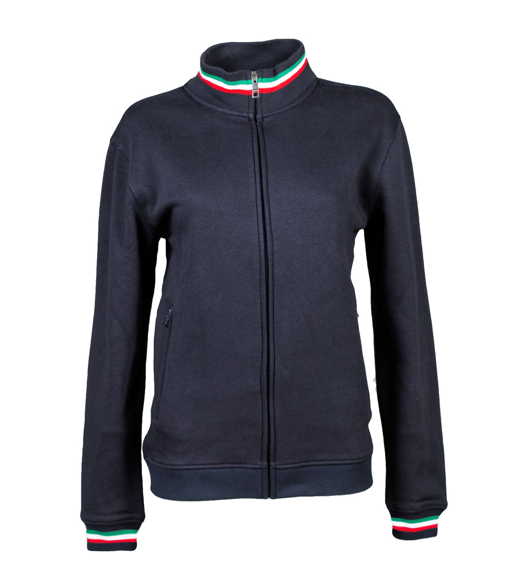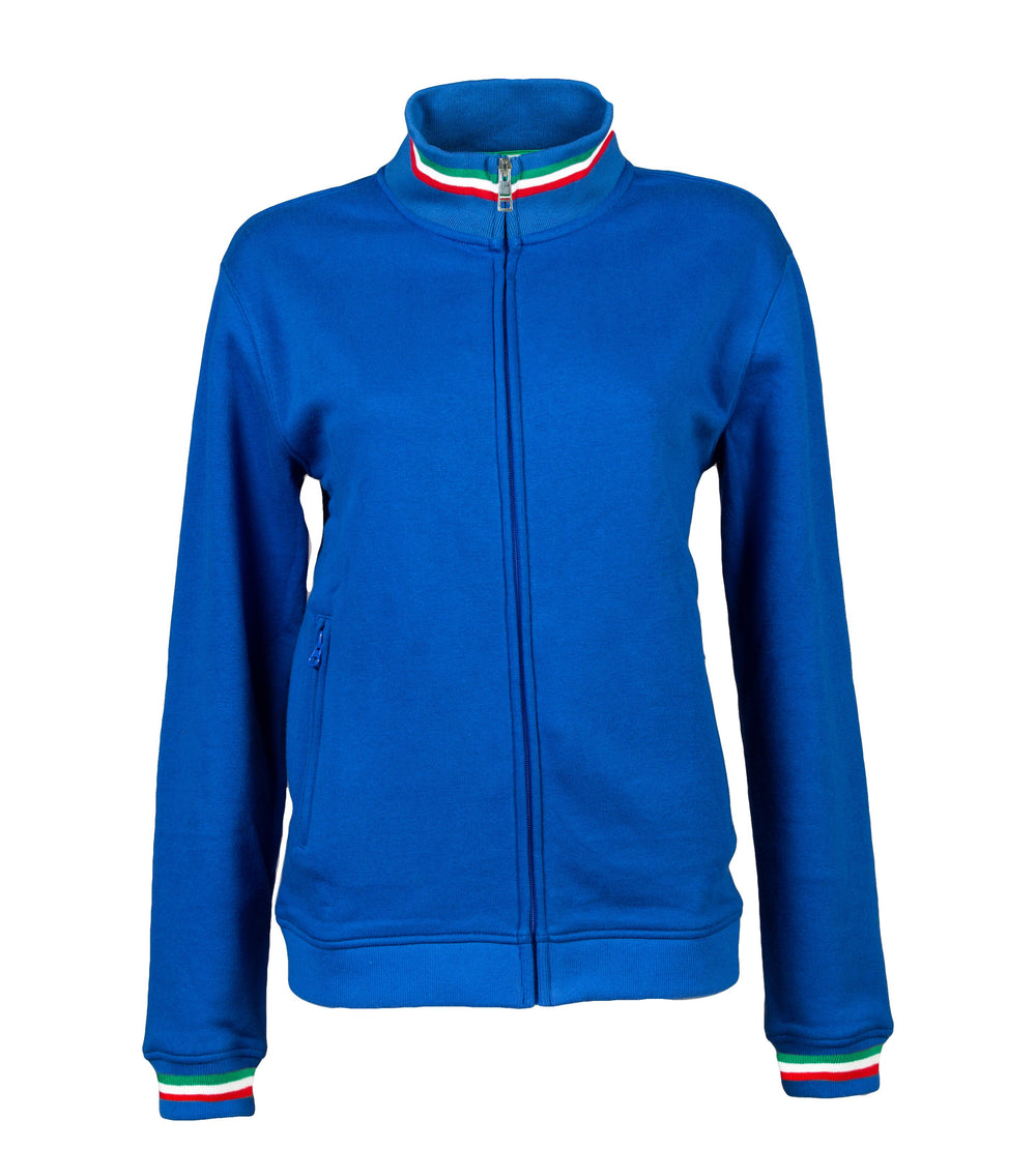 Felpa 80% cotone - 20% poliestere - Collo a lupetto con tricolore interno ed esterno, zip lunga coperta, tirazip in metallo con tricolore interno ed esterno, due tasche con zip coperte, polsini in costina elasticizzata con tricolore. Collo, polsini e fondo maglia in costina elasticizzata h cm 8, nastro di rinforzo nel collo e cuciture ribattute.