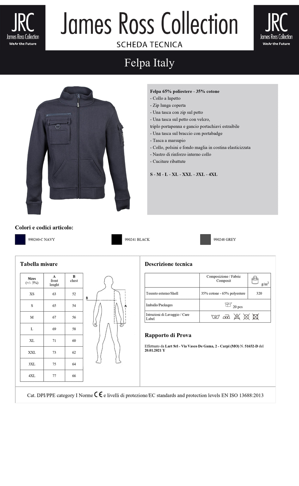 Felpa 65% poliestere - 35% cotone. Collo a lupetto, zip lunga coperta, una tasca con zip sul petto, una tasca sul petto con velcro, triplo portapenna e gancio portachiavi estraibile, una tasca sul braccio con portabadge e tasca a marsupio. Collo, polsini e fondo maglia in costina elasticizzata, nastro di rinforzo interno collo e cuciture ribattute.