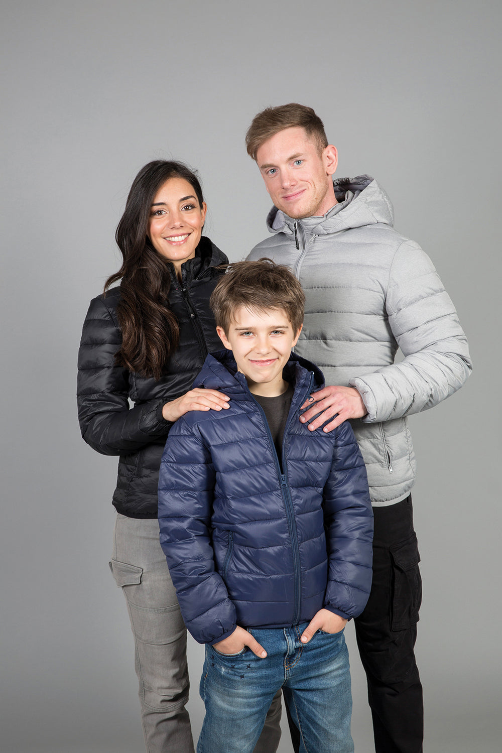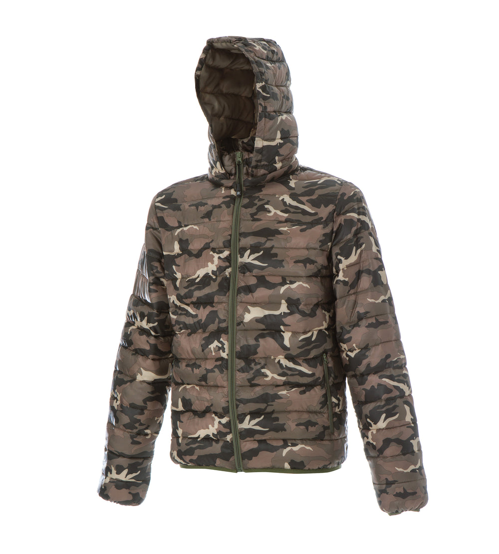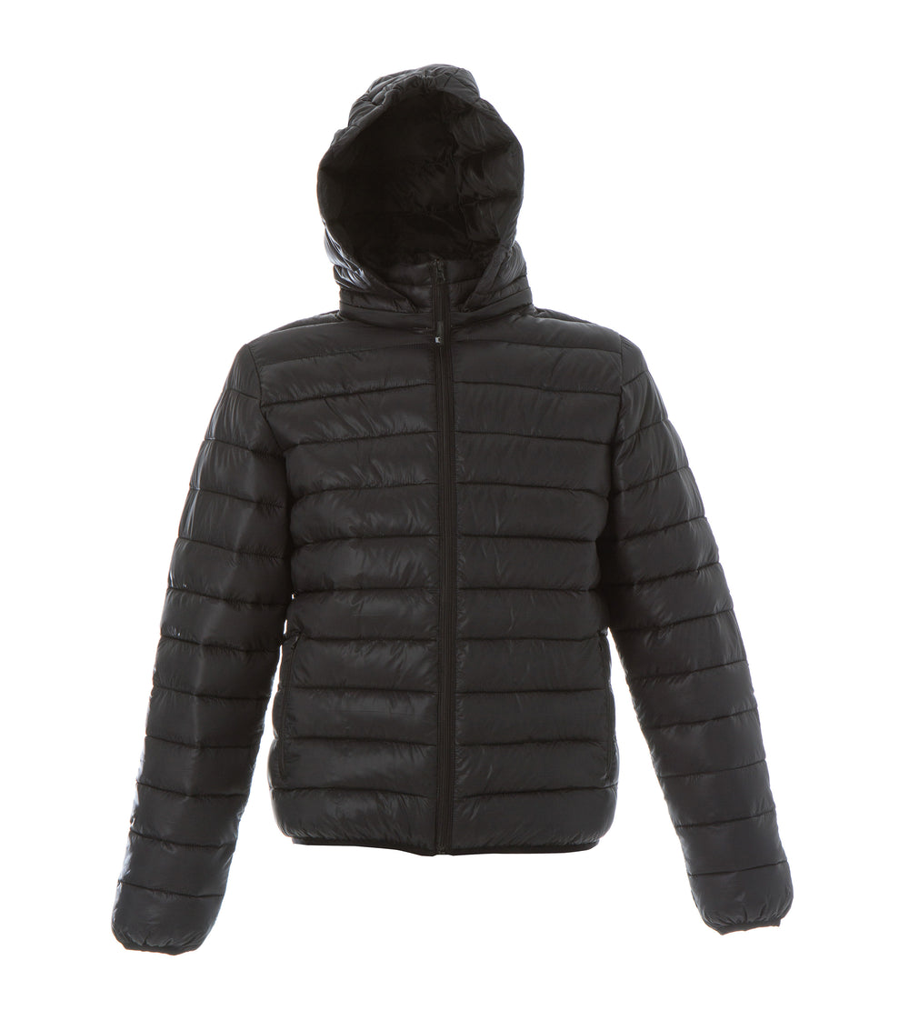 Giubbino uomo in nylon 20D morbido, lucido, impermeabile e imbottito - Fodera morbida in polyester 300T - Imbottitura in soffice poliestere (effetto piuma). Cappuccio imbottito staccabile mediante zip coperta, due tasche con zip e una tasca interna portafoglio, tessuto elastico nel fondo e ai polsini.