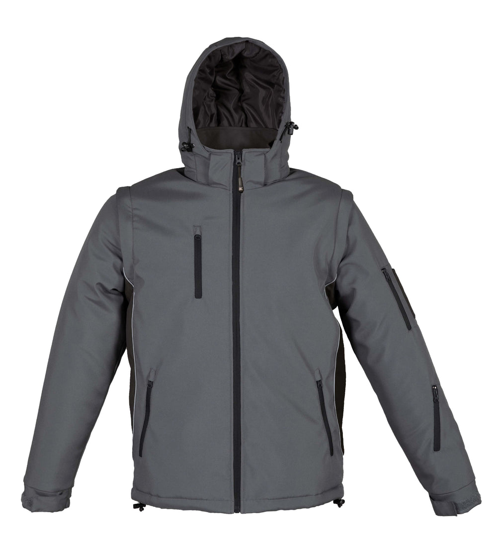 Giubbino in soft shell a due strati impermeabile e imbottito - 100% poliestere stretch - Impermeabilità 6000 mm/H2O - Fodera in poliestere, imbottitura in poliestere, maniche staccabili, cappuccio staccabile, profili rifrangenti sui fianchi, cerniere nastrate YKK. Una tasca sul petto con zip coperta, due tasche esterne con zip coperte, due tasche con zip sul braccio, doppio portapenna sul braccio e una tasca interna portafoglio. Polsini con elastico regolabili con velcro, coulisse al fondo.