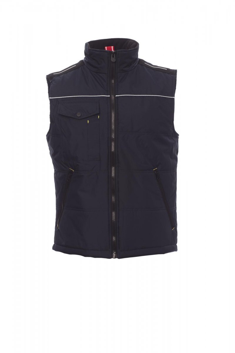 Gilet unisex, zip 8 mm in plastica con cursore in metallo, retro sagomato, due ampie tasche esterne con zip, ampia tasca la petto porta smartphone, anello porta badge, piping reflex al petto e sulla schiena. Interno: imbottitura trapuntata e rifinita con fodera ad alta densità, interno colletto in pile, una tasca.