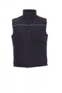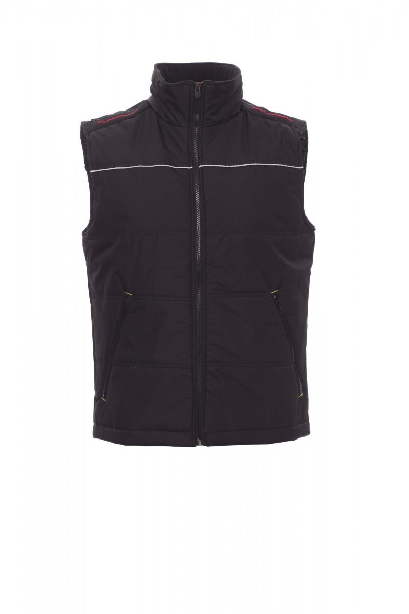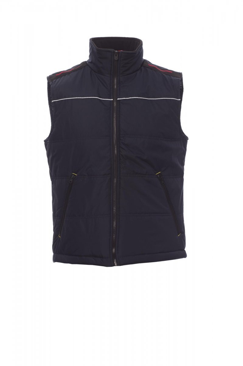 Gilet unisex, zip 5mm in plastica con cursore in metallo, retro sagomato, due ampie tasche esterne con zip, piping reflex al petto e sulla schiena. Interno: imbottitura trapuntata e rifinita con fodera ad alta densità, interno colletto in pile, una tasca.