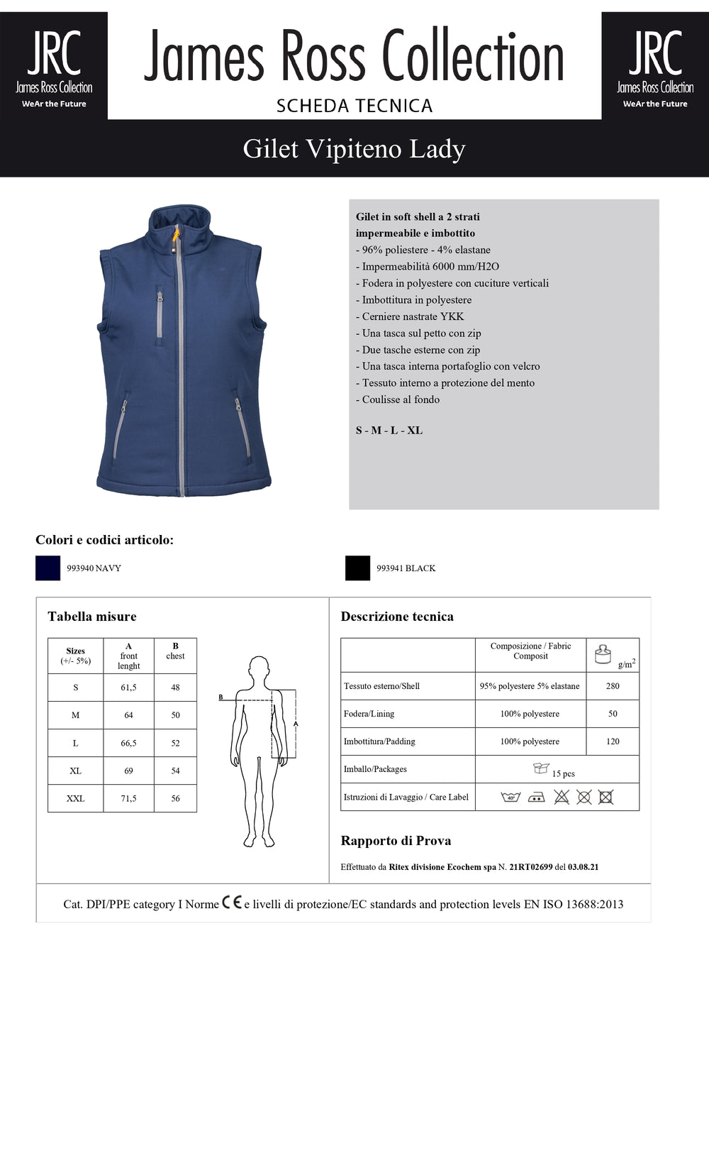 Gilet in soft shell a 2 strati impermeabile e imbottito - 96% poliestere - 4% elastane - Impermeabilità 6000 mm/H2O. Fodera in polyestere con cuciture verticali, imbottitura in polyestere, cerniere nastrate YKK. Una tasca sul petto con zip, due tasche esterne con zip, una tasca interna portafoglio con velcro, tessuto interno a protezione del mento, coulisse al fondo.