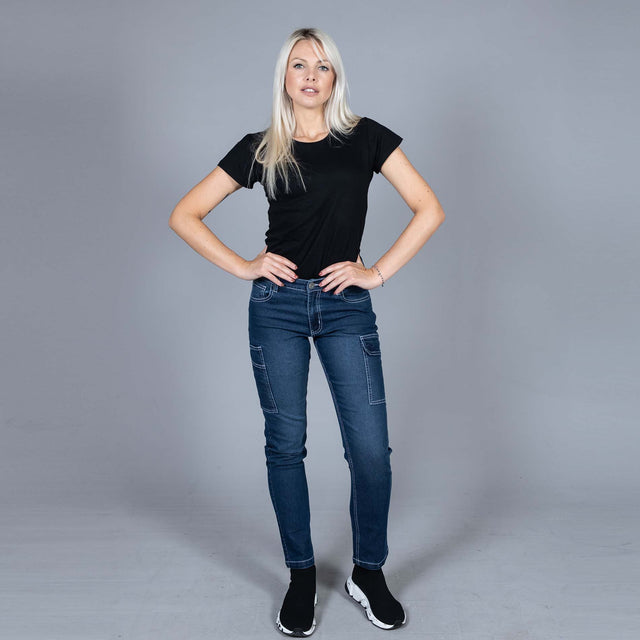 Pantalone jeans multitasche elasticizzato 81% cotone 17% polyestere 2% elastane - Tessuto prelavato, due tasche anteriori con taschino portamoneta, una tasca laterale con chiusura con velcro, doppia tasca laterale portautensili o portametro e due tasche posteriori