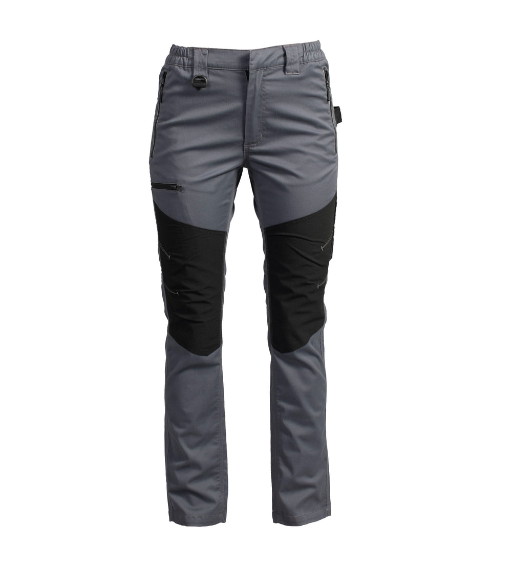 Pantalone multitasche elasticizzato - Tessuto principale in 65% poliestere - 33% cotone - 2% elastan - Tessuto antiabrasione elasticizzato 92% poliestere - 8% elastan sulle ginocchia con impunture in contrasto. triple cuciture, Due tasche anteriori con zip con nastratura rifrangente, una tasca laterale con zip, una tasca posteriore aperta, una tasca posteriore con zip con nastratura rifrangente e doppia tasca laterale portautensili o portametro. Gancio portamartello, elastici in vita sui fianchi e passanti maggiorati, gancio portachiavi o portabadge in pvc, bottone automatico in vita coperto.