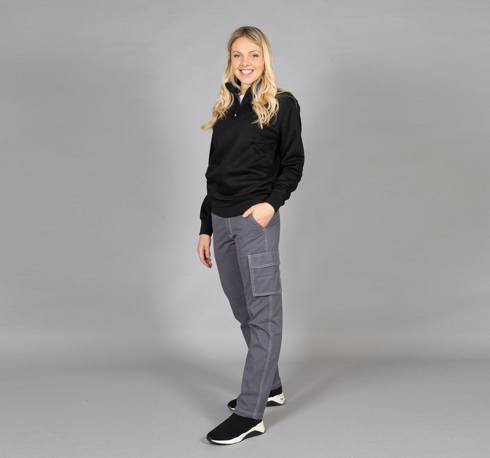 Pantalone da donna multitasche 100% cotone - Tessuto prelavato. Cuciture in contrasto, elastici in vita e sui fianchi, due tasche anteriori, una tasca laterale a soffietto con velcro, doppia tasca laterale portautensili o portametro e una tasca posteriore con velcro, bottone automatico in vita coperto. - Nessun elemento graffiante.