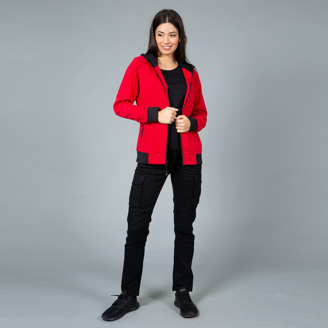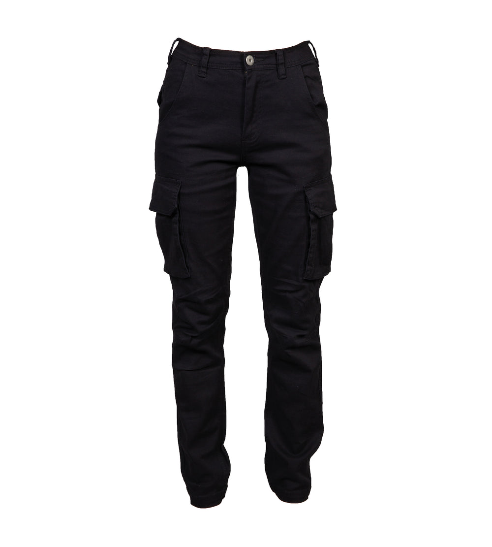 Pantalone donna multitasche elasticizzato - 98% cotone – 2% elastan - Tessuto prelavato. Due tasche anteriori, due tasche laterali con bottoni automatici coperti, due tasche posteriori con bottoni automatici coperti e cucitura sulle ginocchia per maggior comfort