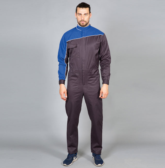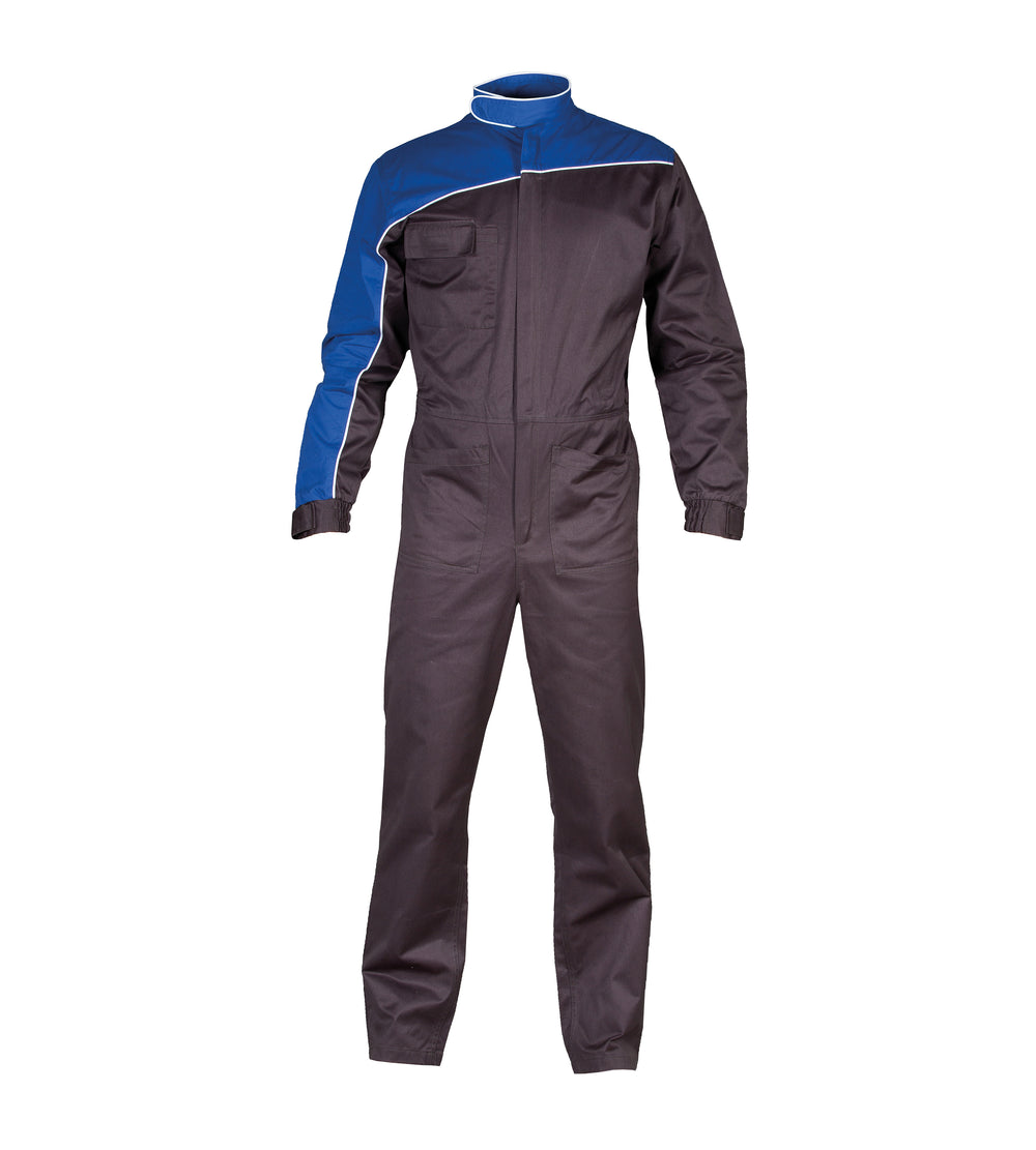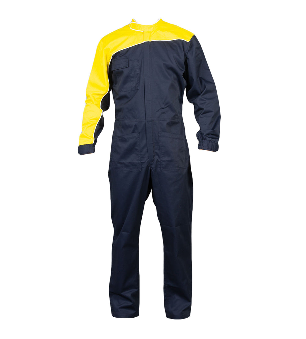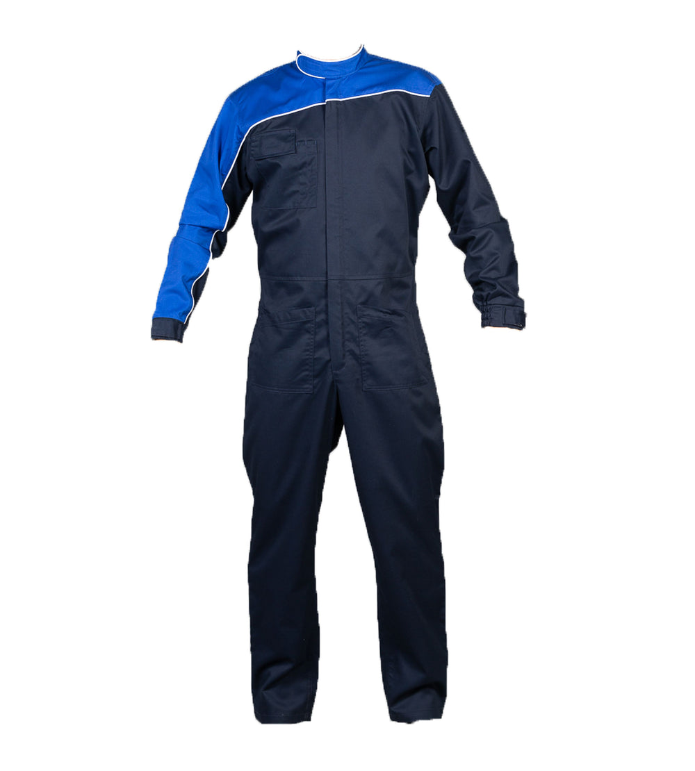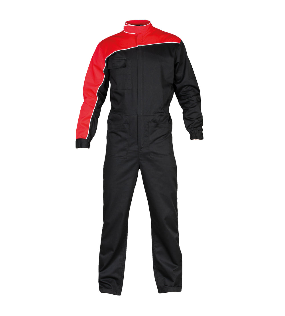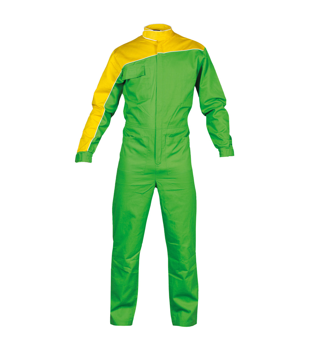 Tuta pubblicitaria bicolore - 65% polyester - 35% cotone. Zip lunga coperta, parte superiore corpo e manica destra in contrasto, piping sulla manica destra, sul torace, sulla schiena e sul colletto, colletto "pilota" con velcro. Una tasca sul petto con doppio portapenna, due tasche aperte frontali, elastico in vita nella parte posteriore e polsini elastici con chiusura con velcro.