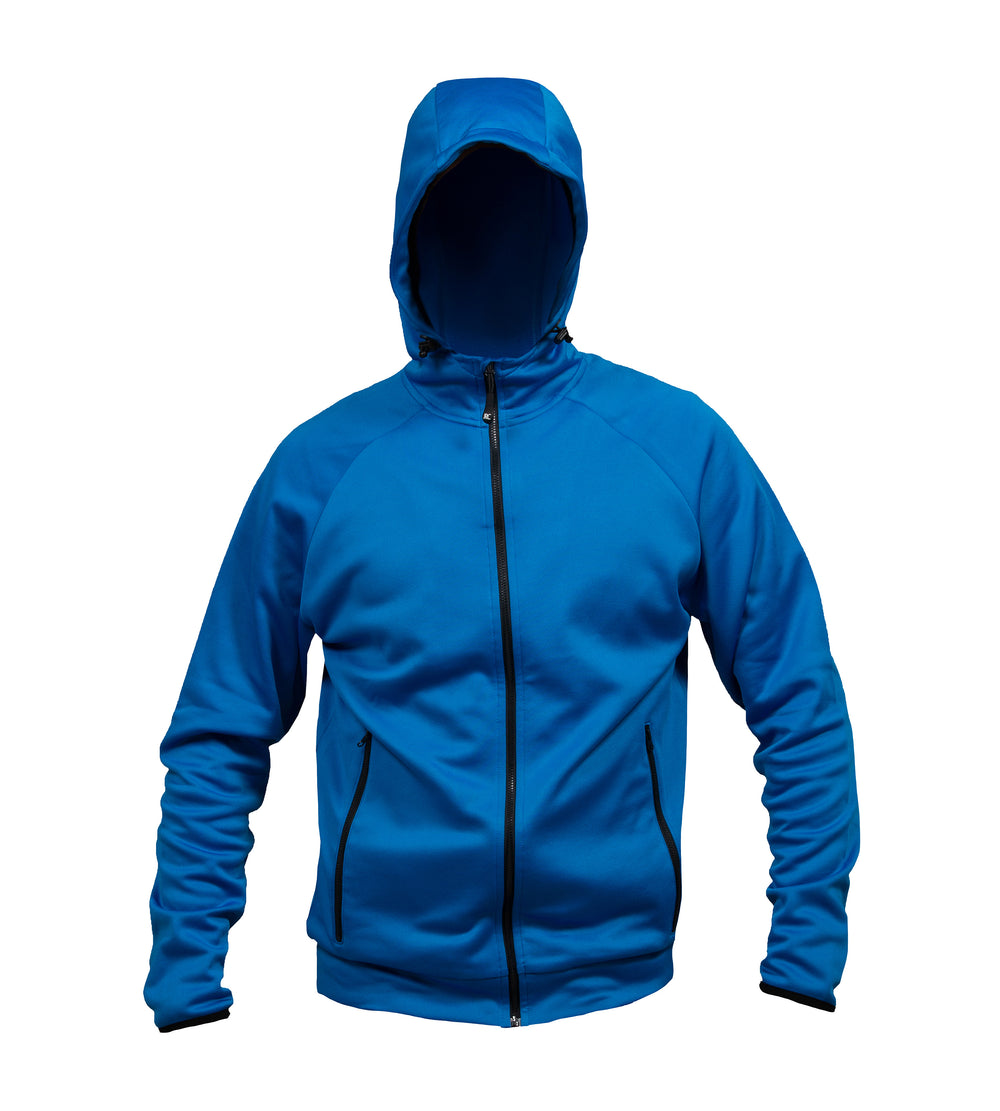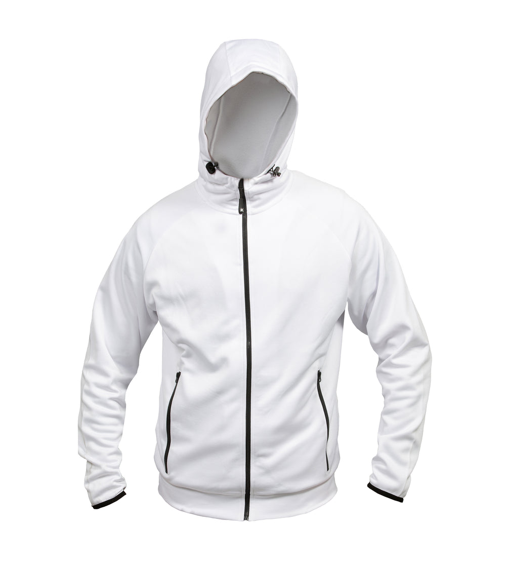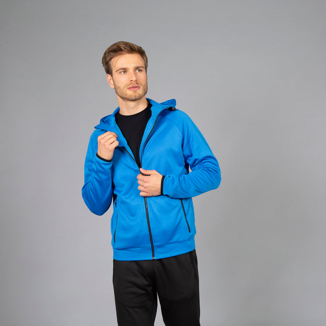 Felpa da uomo 100% poliestere - Tessuto tecnico con interno in micropile, zip lunga, maniche raglan, cappuccio con coulisse, colletto rialzato. Due tasche con zip, tessuto elasticizzato ai polsi e fondo maglia in tessuto elasticizzato.