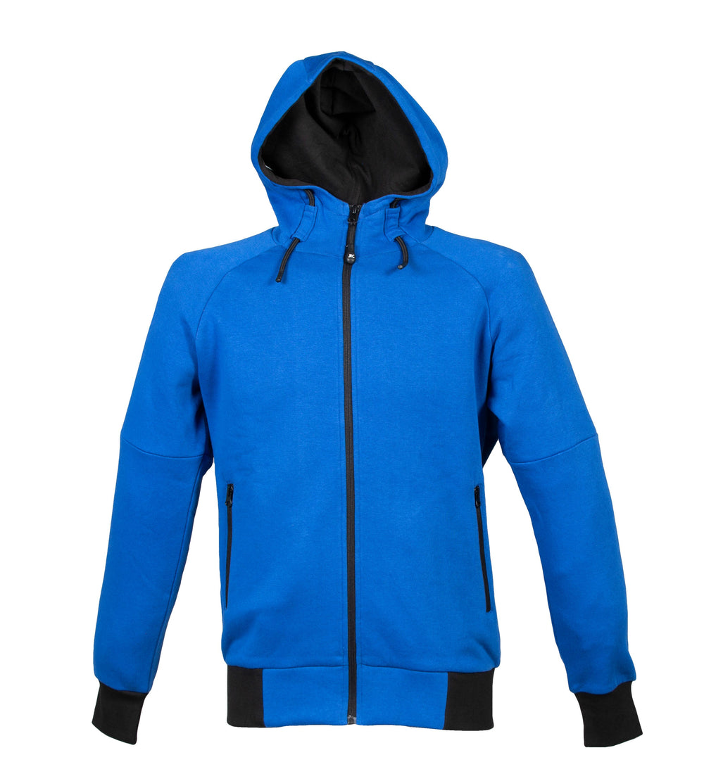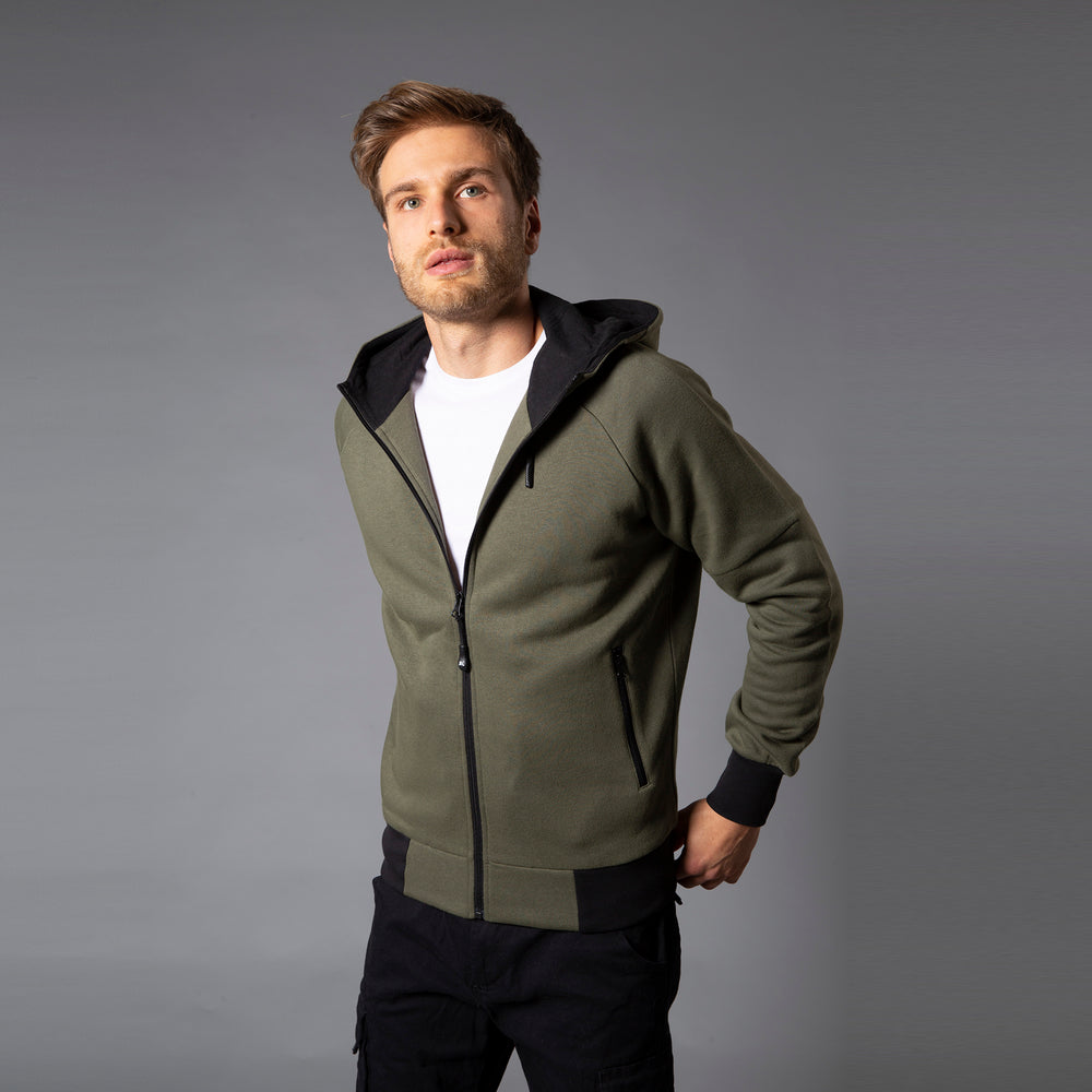 Felpa da uomo 80% cotone - 20%poliestere. Cappuccio con cordini in contrasto, fodera cappuccio in jersey in contrasto, colletto rialzato, zip lunga nastrata in contrasto. Due tasche con zip nastrate in contrasto, polsini e fondo maglia in costina elasticizzata in contrasto, nastro di rinforzo interno collo, cuciture ribattute e maniche raglan.