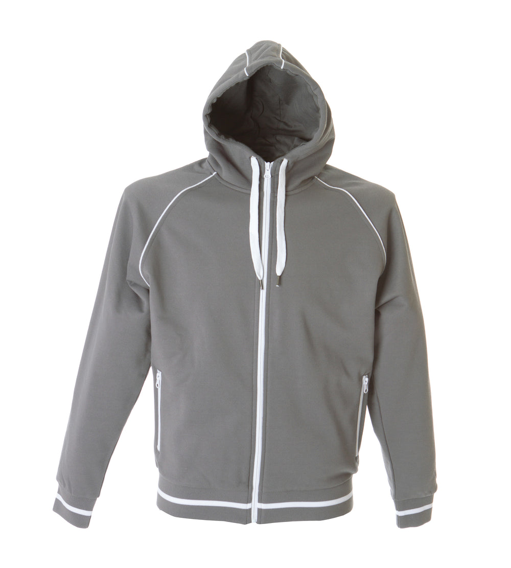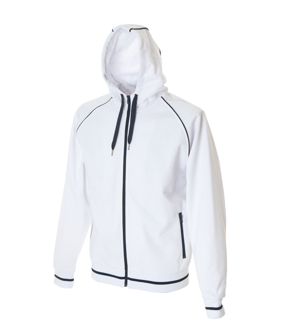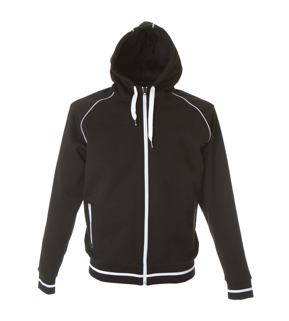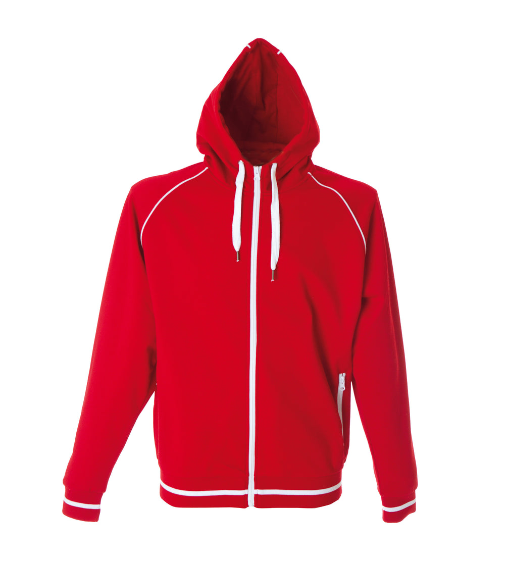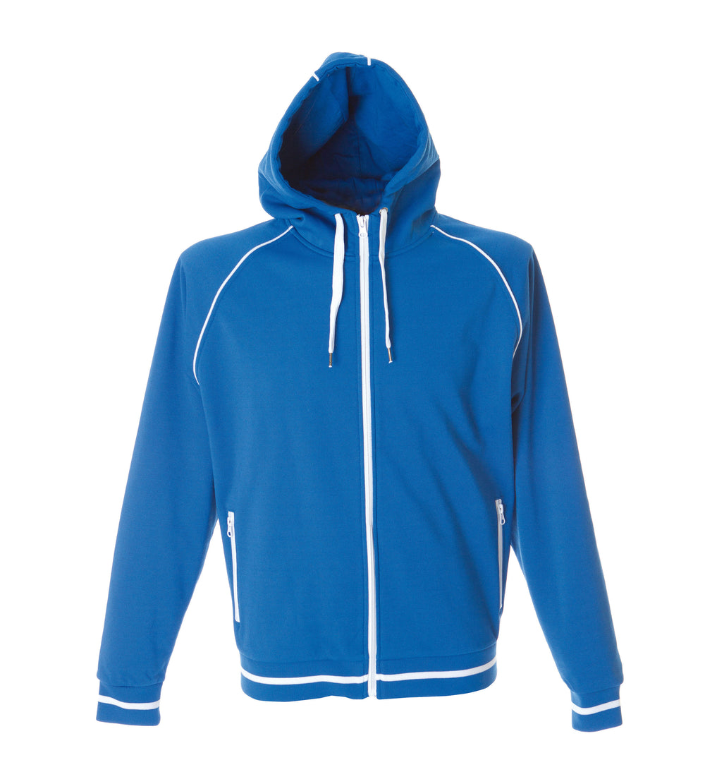 Felpa cotone – poliestere tessuto sportive "DRY" con trattamento anti-acqua. Cappuccio foderato con cordini in contrasto, zip lunga nastrata, maniche raglan, due tasche con zip nastrate. Profili in contrasto su cappuccio e spalle, nastro di rinforzo bicolore nel collo, polsini e fondo maglia in costina elasticizzata (con riga in contrasto nel Man e nel Boy).