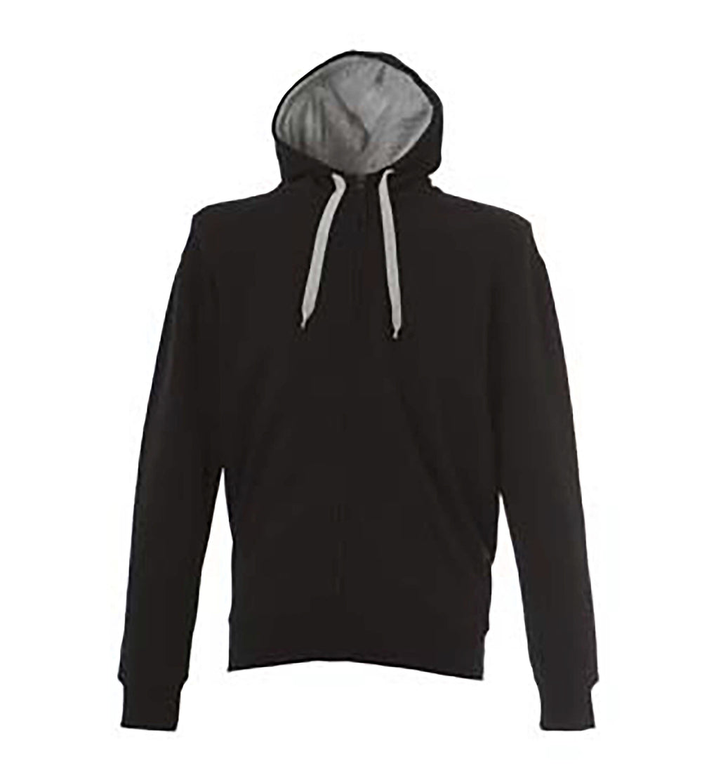 Felpa 35% cotone - 65% poliestere. Cappuccio foderato in jersey con cordini in contrasto, colletto rialzato, zip lunga coperta, tasche a marsupio. Nastro di rinforzo interno collo e nastro in contrasto interno lungo la zip, polsini e fondo maglia in costina elasticizzata, cuciture ribattute.