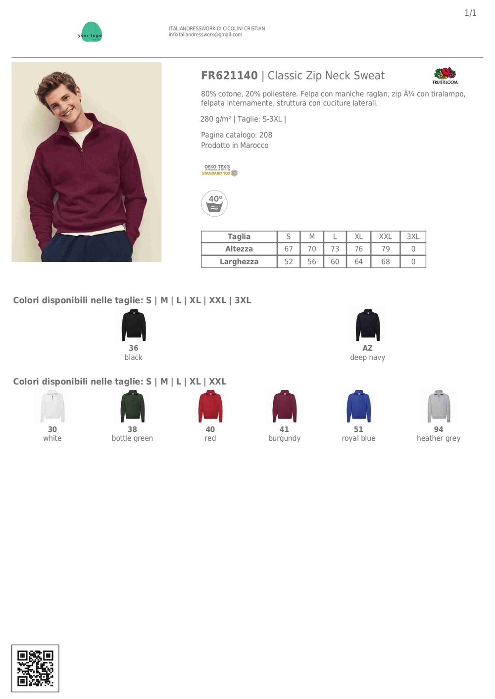 FELPA CON MEZZA ZIP FRUIT OF THE LOOM 621140 CLASSIC ZIP NECK SWEAT UOMO
