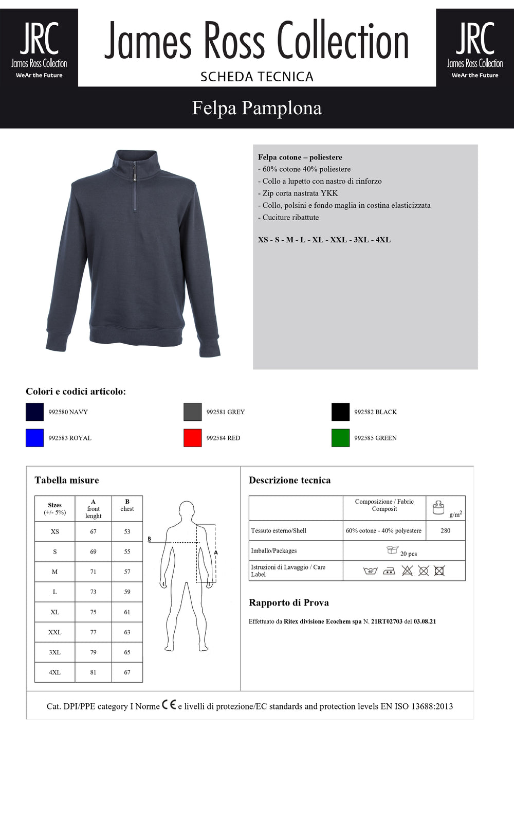 Felpa 60% cotone 40% poliestere. Collo a lupetto con nastro di rinforzo, zip corta nastrata YKK; collo, polsini e fondo maglia in costina elasticizzata, cuciture ribattute.