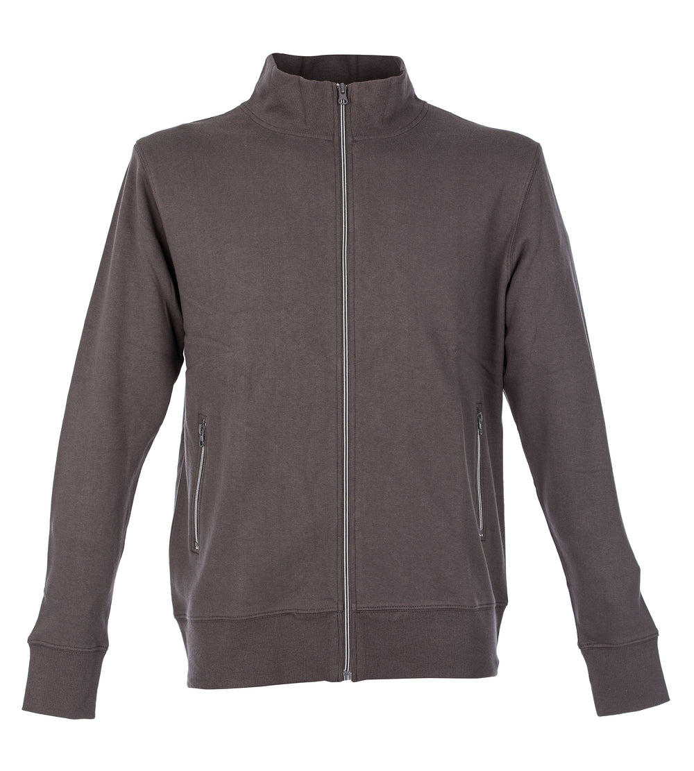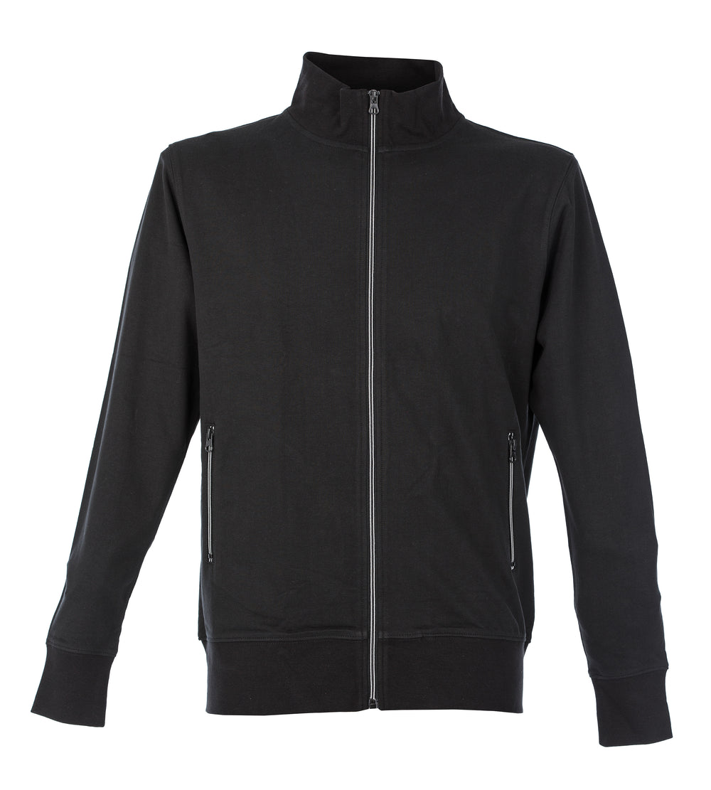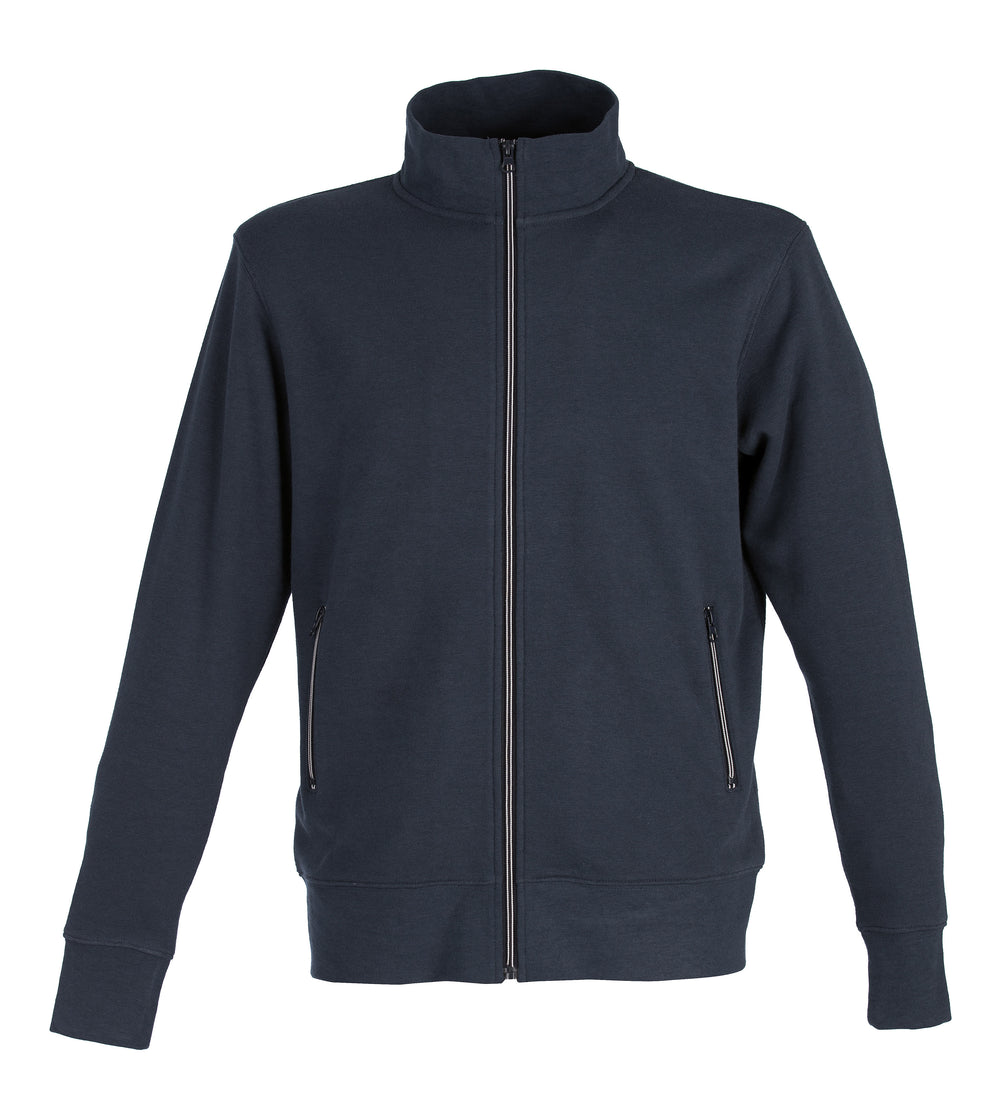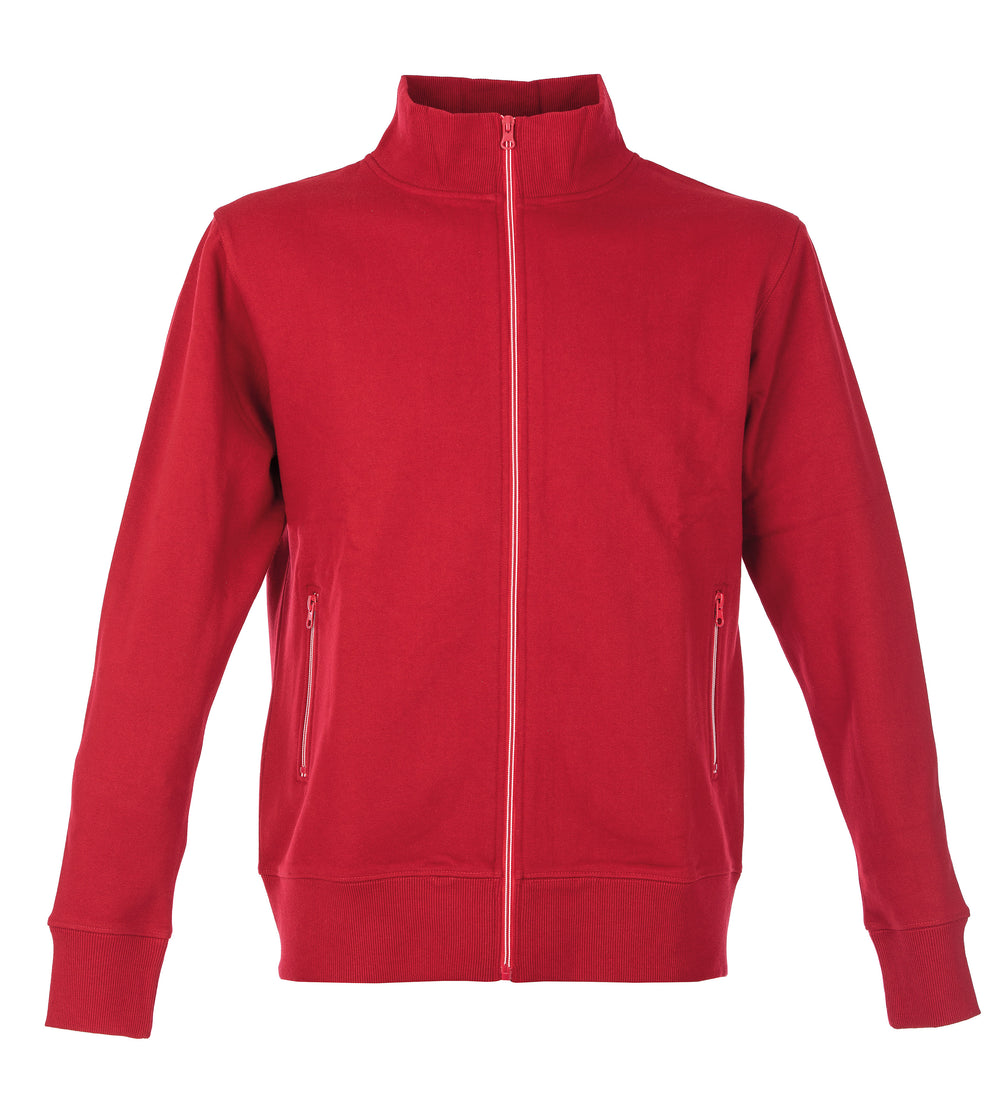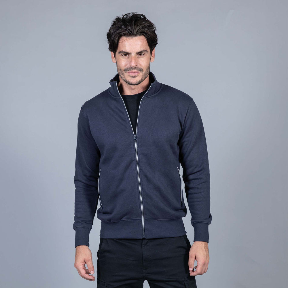 Felpa cotone - poliestere. Collo a lupetto, cerniere con profilatura in contrasto, zip lunga, due tasche con zip, nastro di rinforzo bicolore interno collo; collo, polsini e fondo maglia in costina elasticizzata e cuciture ribattute.