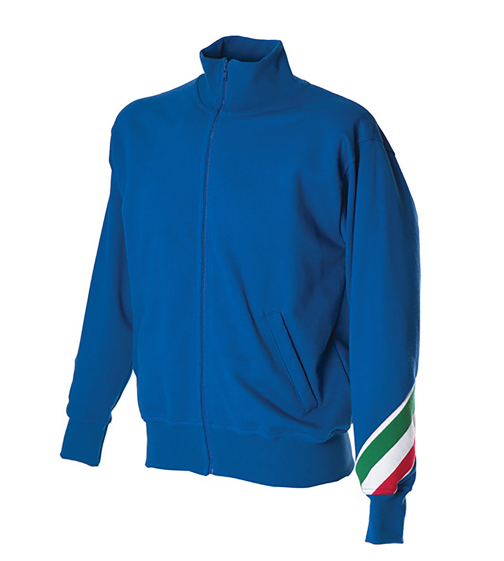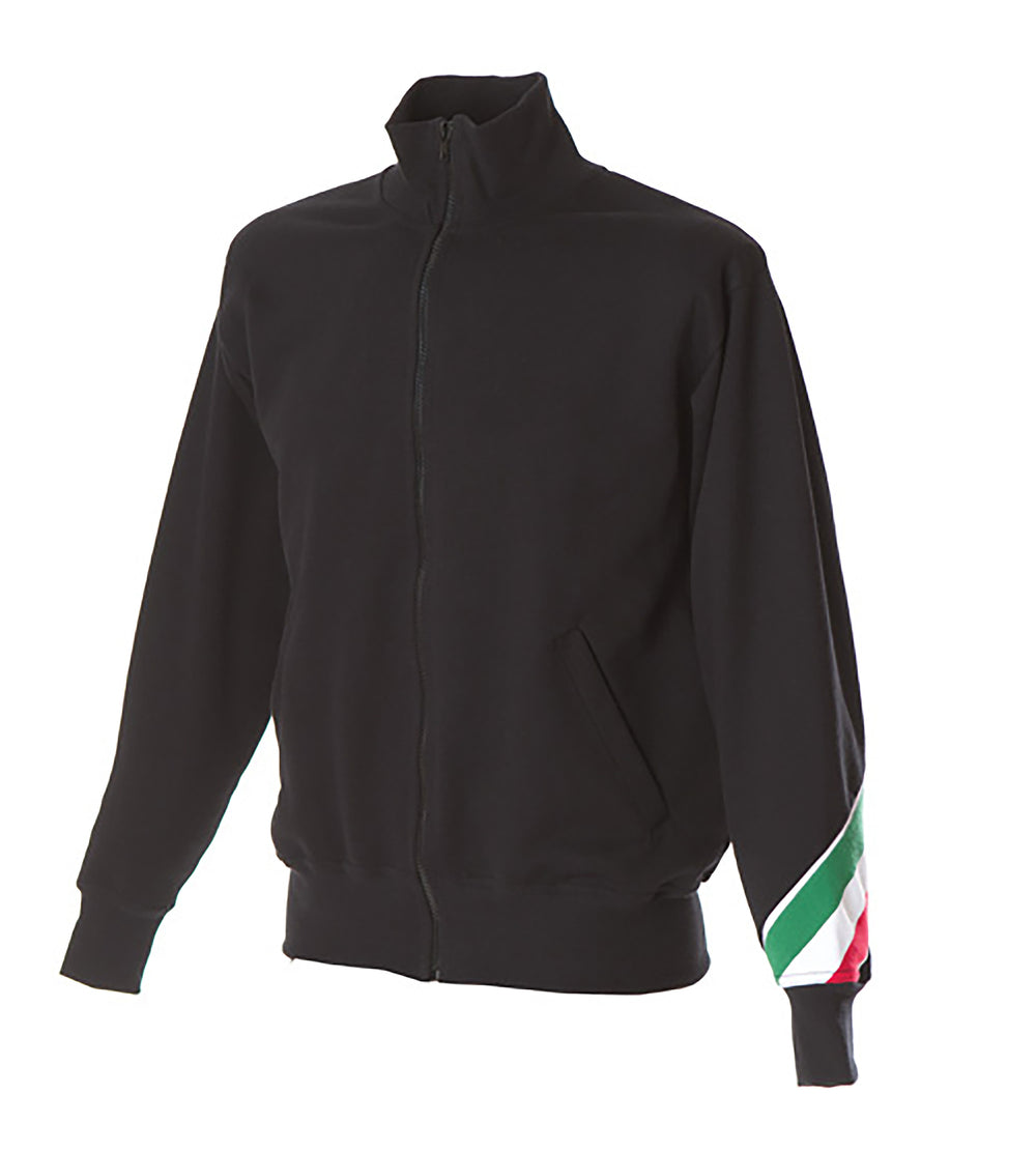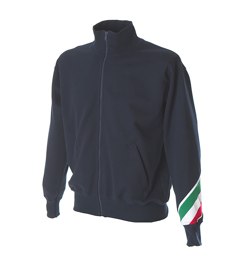 Felpa made in Italy 100% cotone. Collo a lupetto in costina, zip lunga, torcia tricolore sul braccio, due tasche aperte a filetto, polsini e fondo maglia in costina h cm 8, cuciture ribattute.