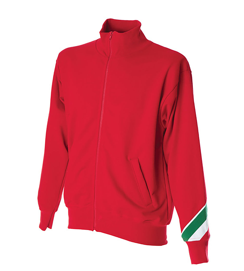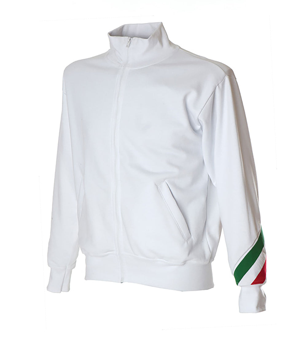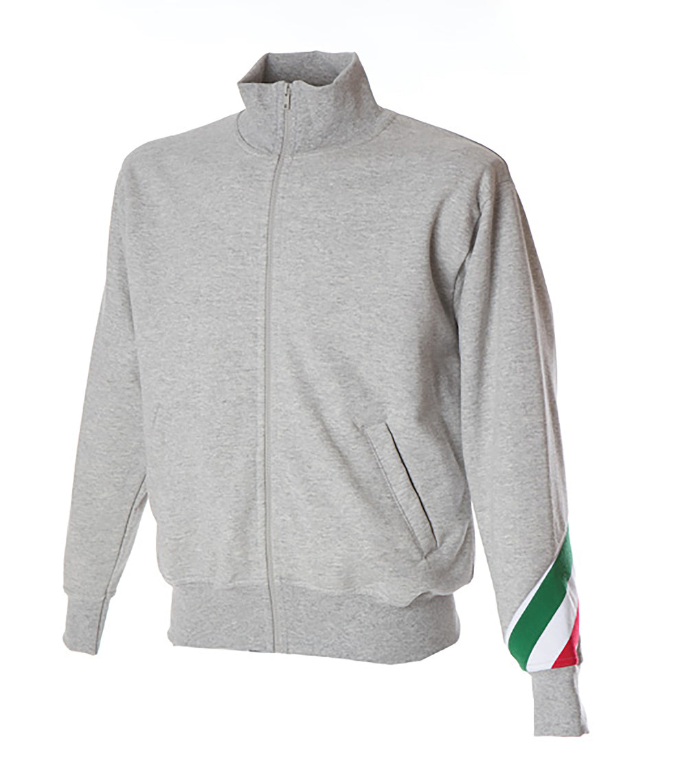 Felpa made in Italy 100% cotone. Collo a lupetto in costina, zip lunga, torcia tricolore sul braccio, due tasche aperte a filetto, polsini e fondo maglia in costina h cm 8, cuciture ribattute.