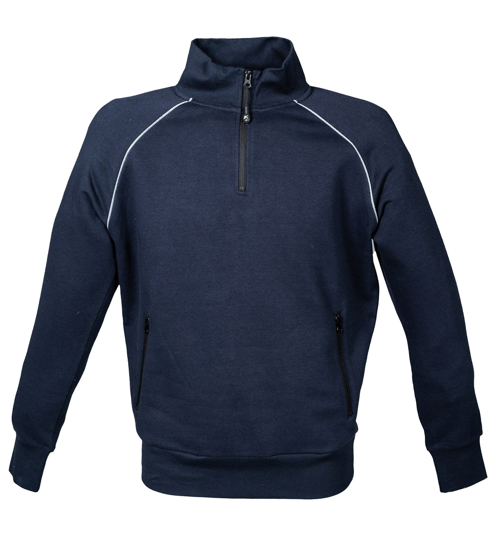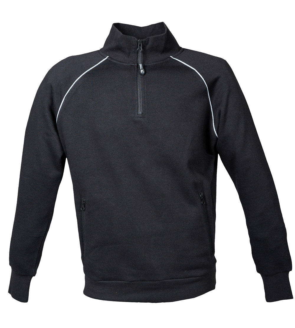 Felpa 80% cotone 20%poliestere. Zip corta, collo a lupetto, maniche raglan con piping rifrangente anteriore e posteriore, due tasche con zip. Collo, polsini e fondo maglia in costina elasticizzata, nastro di rinforzo interno collo in contrasto e cuciture ribattute.