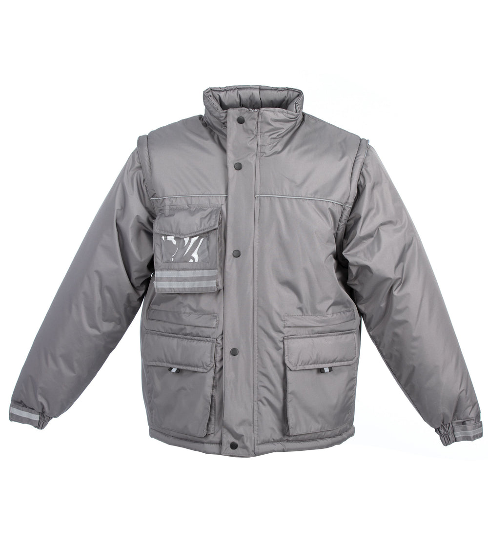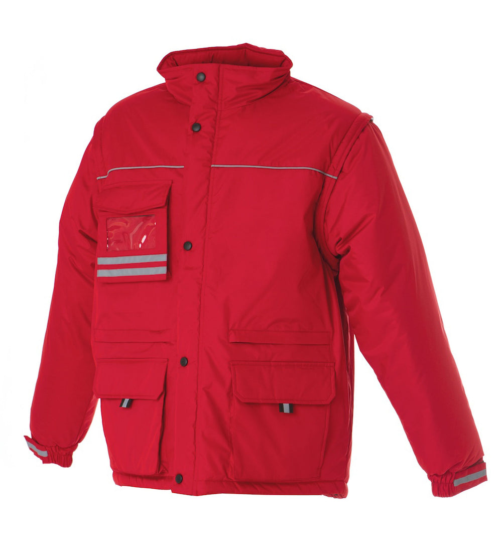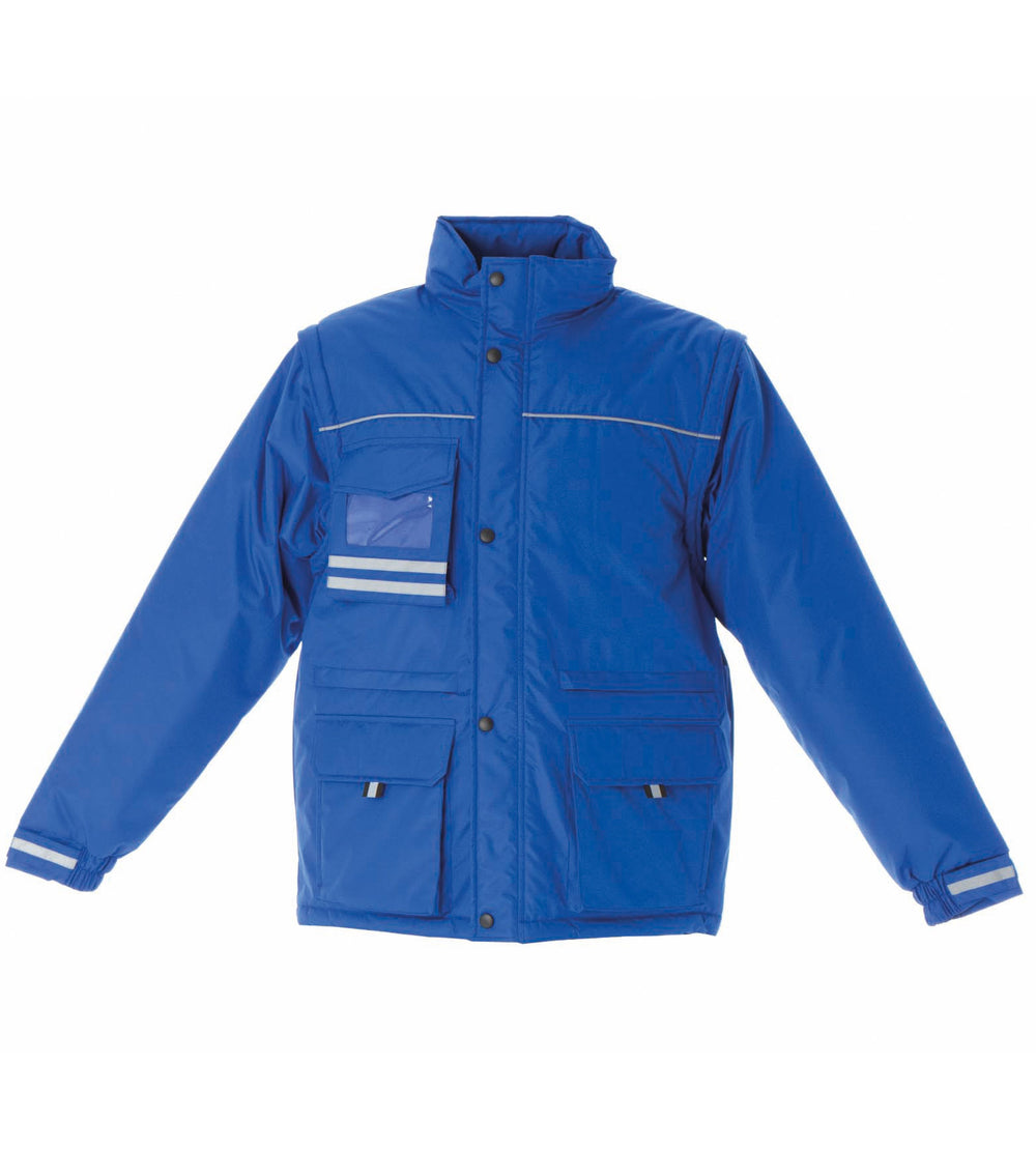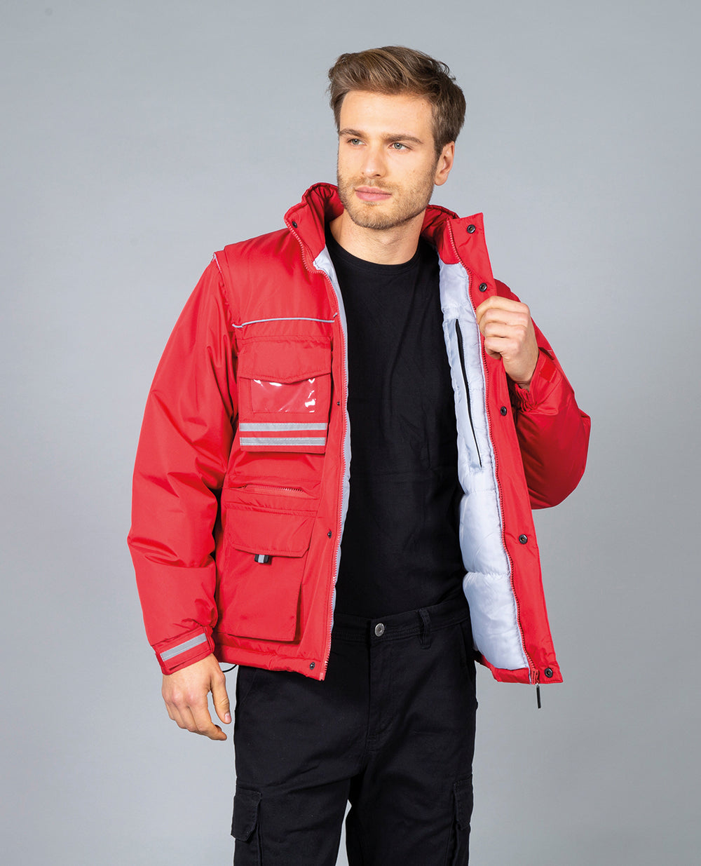 Giubbino in nylon ripstop impermeabile e antistrappo - Imbottitura in poliestere, maniche staccabili, fodera in poliestere, cappuccio estraibile in ripstop, profili rifrangenti. Tasca sul petto con portabadge a scomparsa, due doppie tasche con patta e chiusura in velcro, due tasche con zip coperta e fodera rinforzata per utensili e tasca interna portafoglio. Polsini elastici regolabili con velcro, coulisse al fondo, bottoni automatici in metallo, una zip interna per personalizzare su schiena e una per il cuore.