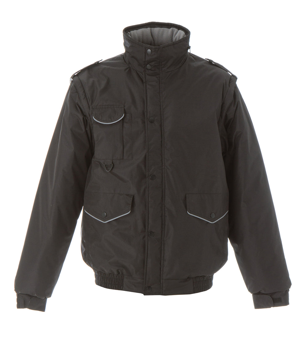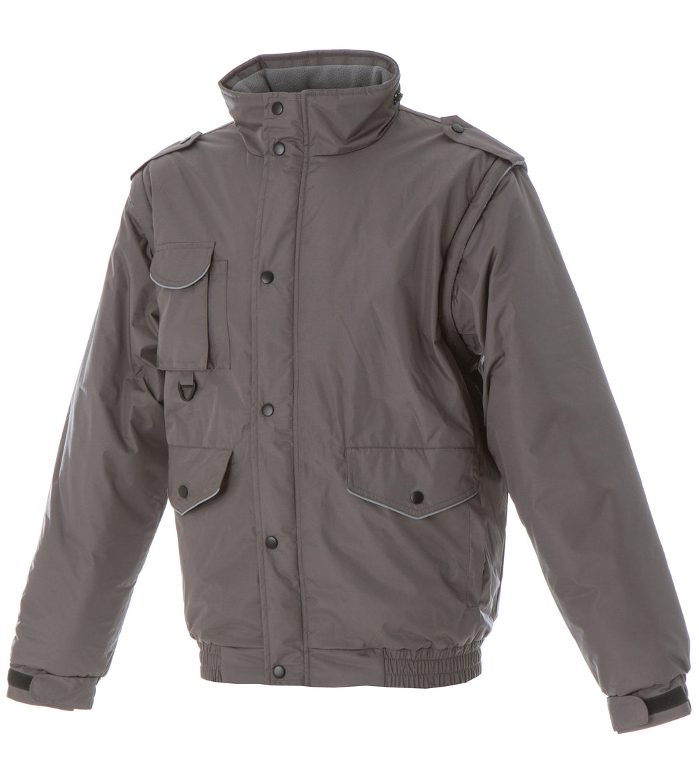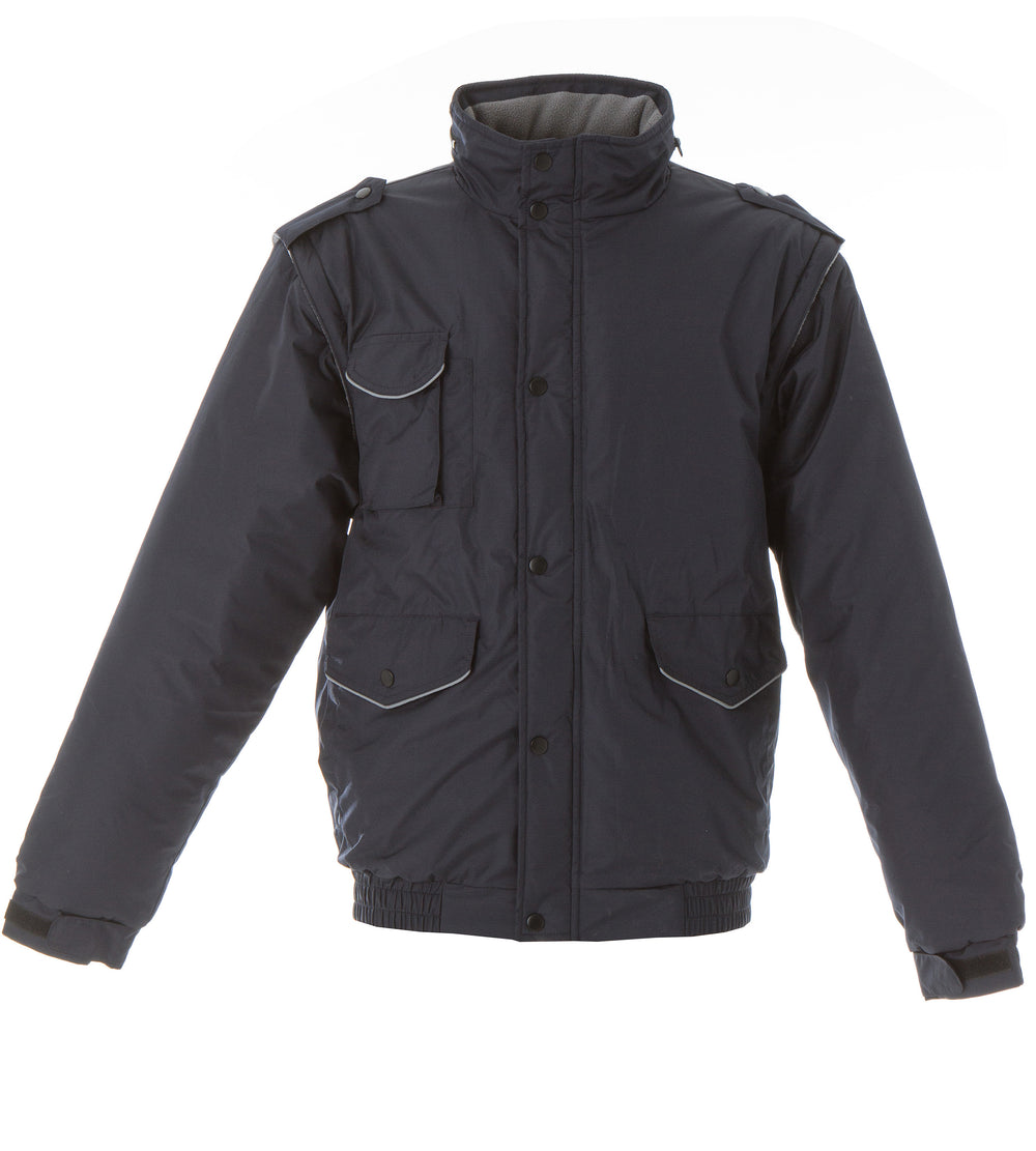Giubbino in nylon ripstop impermeabile e antistrappo - Imbottitura in polyestere, maniche staccabili, fodera in pile antipilling, interno collo in pile antipilling. Cappuccio estraibile in colore fluo antipericolo con chiusura antivento, profili rifrangenti, alamari sulle spalle con bottone, taschino portacellulare con gancio portachiavi, portapenne. Due doppie tasche con bottoni, tasca interna portafoglio con portabadge, polsini elastici regolabili con velcro, una zip interna per personalizzazione su schiena e una per il cuore, bottoni automatici in metallo.