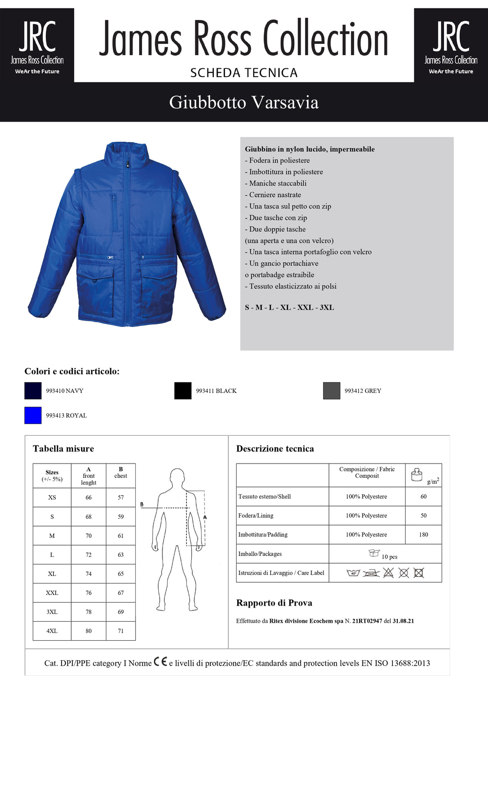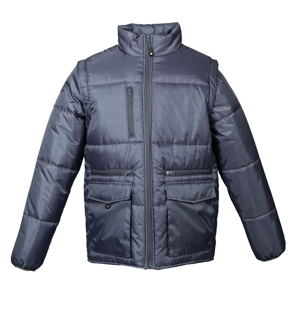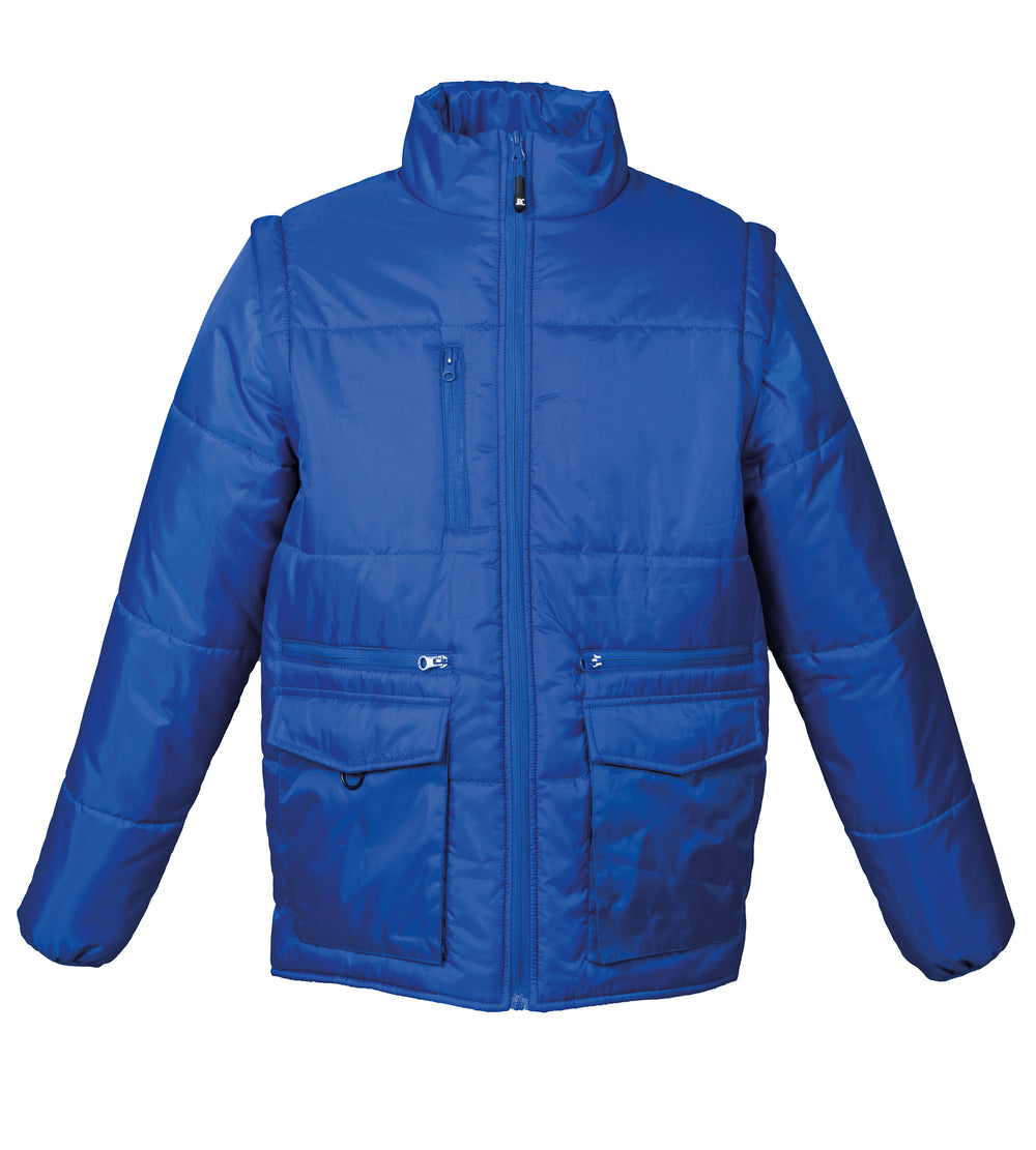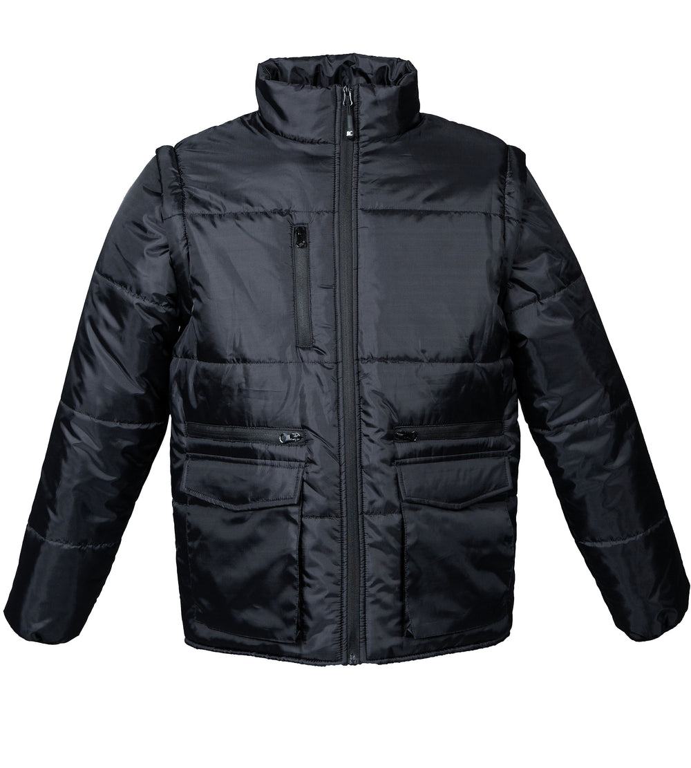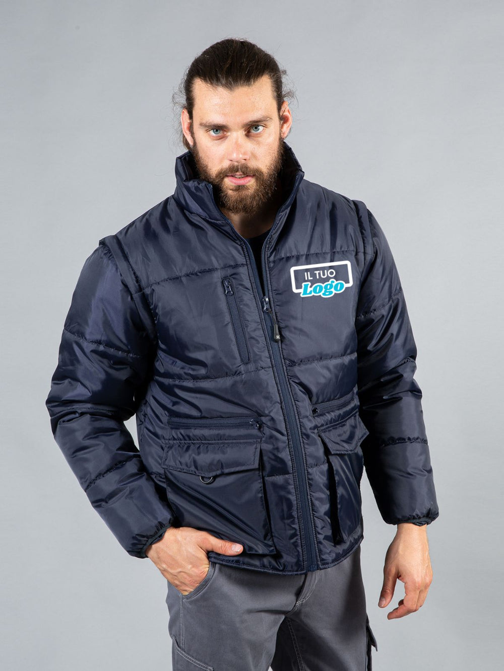 Giubbotto in nylon lucido impermeabile con maniche staccabili, ideale per attività all’aperto o ambienti lavorativi.