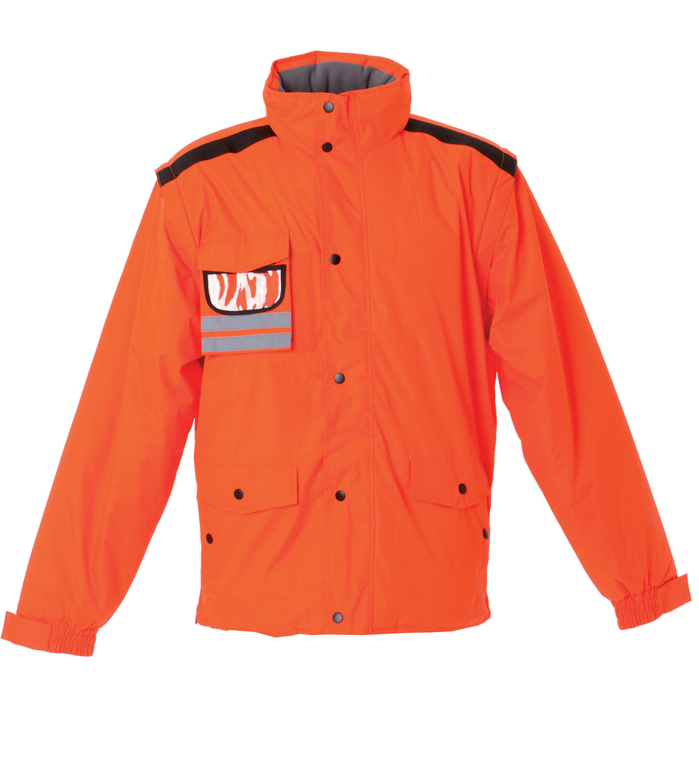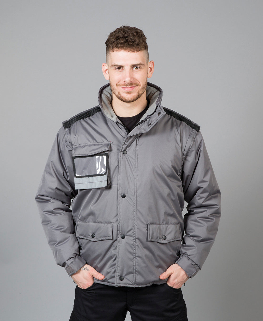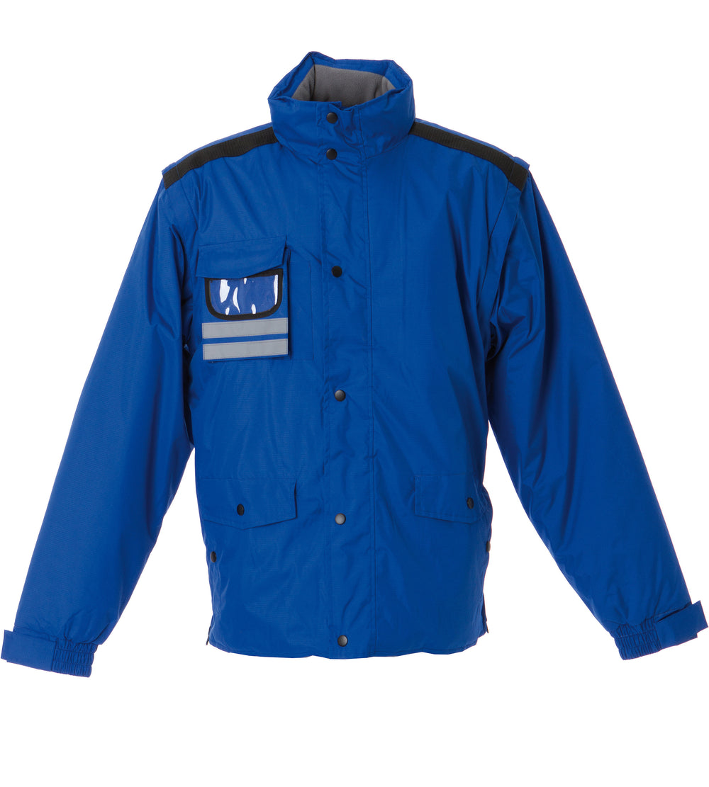 Giubbino in nylon ripstop impermeabile e antistrappo - Imbottitura in polyestere. Maniche staccabili, fodera in pile antipilling e inserti traspiranti sottobraccio, interno collo in pile antipilling, bande rifrangenti, taschino portapenna, cappuccio estraibile in ripstop con chiusura antivento. Tasca sul petto con partabadge a scomparsa e portacellulare interno, due doppie tasche con bottoni e una tasca interna per portafoglio. Zip laterali per regolazione fianchi, tessuto di rinforzo sulle spalle, polsini elastici regolabili con velcro, zip interne sul fondo e sul petto per personalizzare su schiena e cuore, bottoni automatici in metallo.