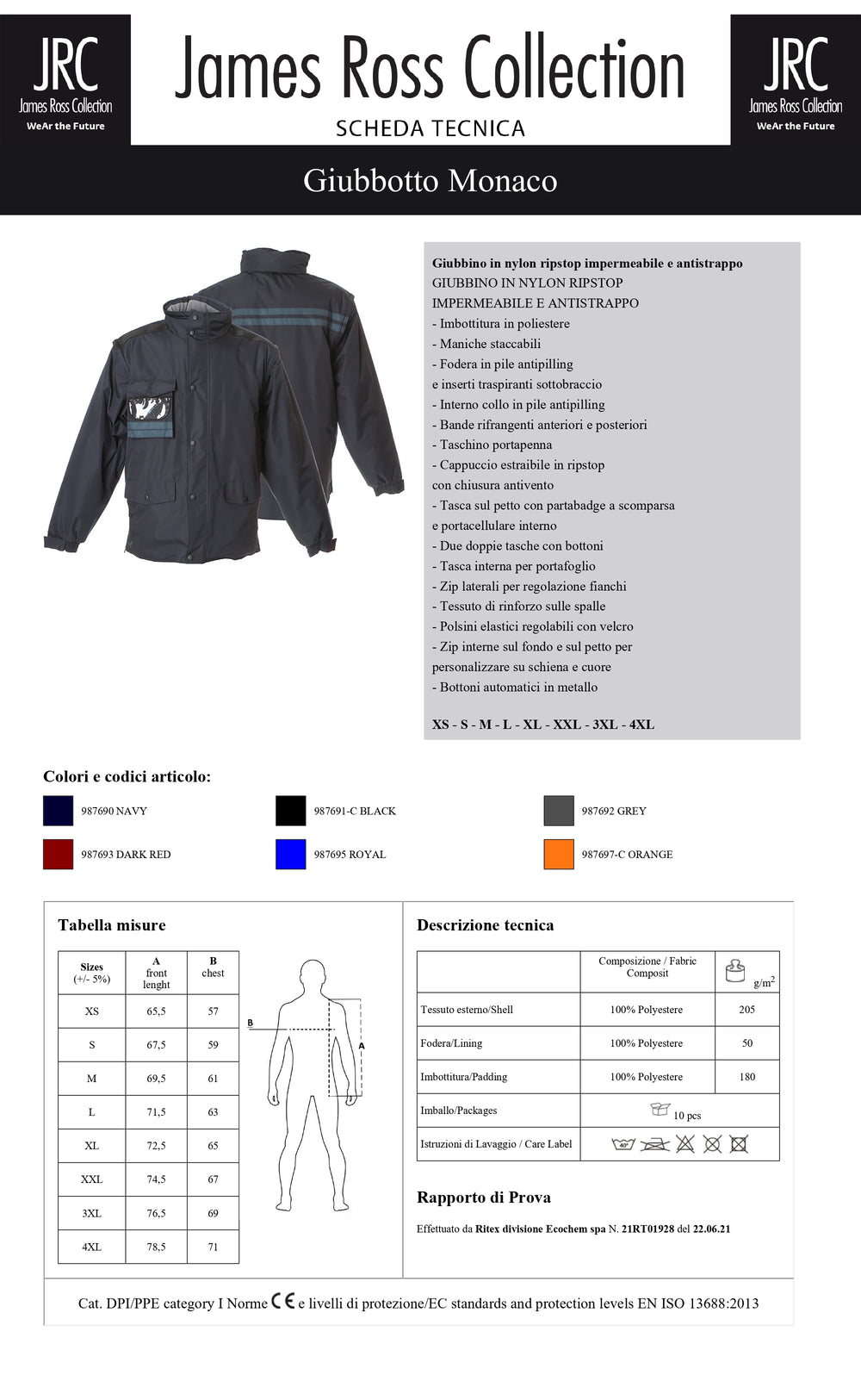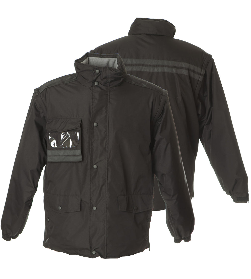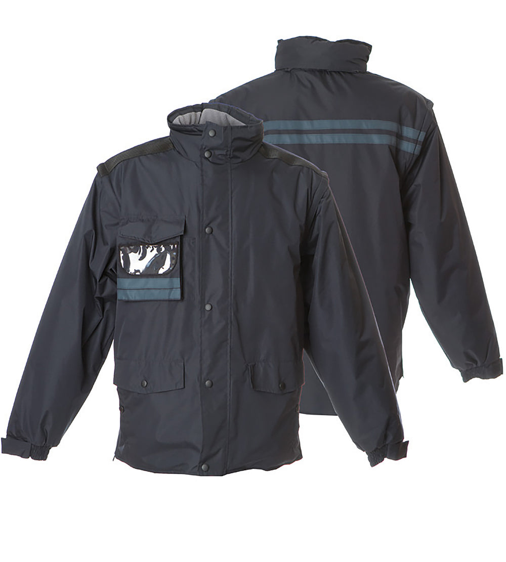 Giubbino in nylon ripstop impermeabile e antistrappo - Imbottitura in polyestere. Maniche staccabili, fodera in pile antipilling e inserti traspiranti sottobraccio, interno collo in pile antipilling, bande rifrangenti, taschino portapenna, cappuccio estraibile in ripstop con chiusura antivento. Tasca sul petto con partabadge a scomparsa e portacellulare interno, due doppie tasche con bottoni e una tasca interna per portafoglio. Zip laterali per regolazione fianchi, tessuto di rinforzo sulle spalle, polsini elastici regolabili con velcro, zip interne sul fondo e sul petto per personalizzare su schiena e cuore, bottoni automatici in metallo.