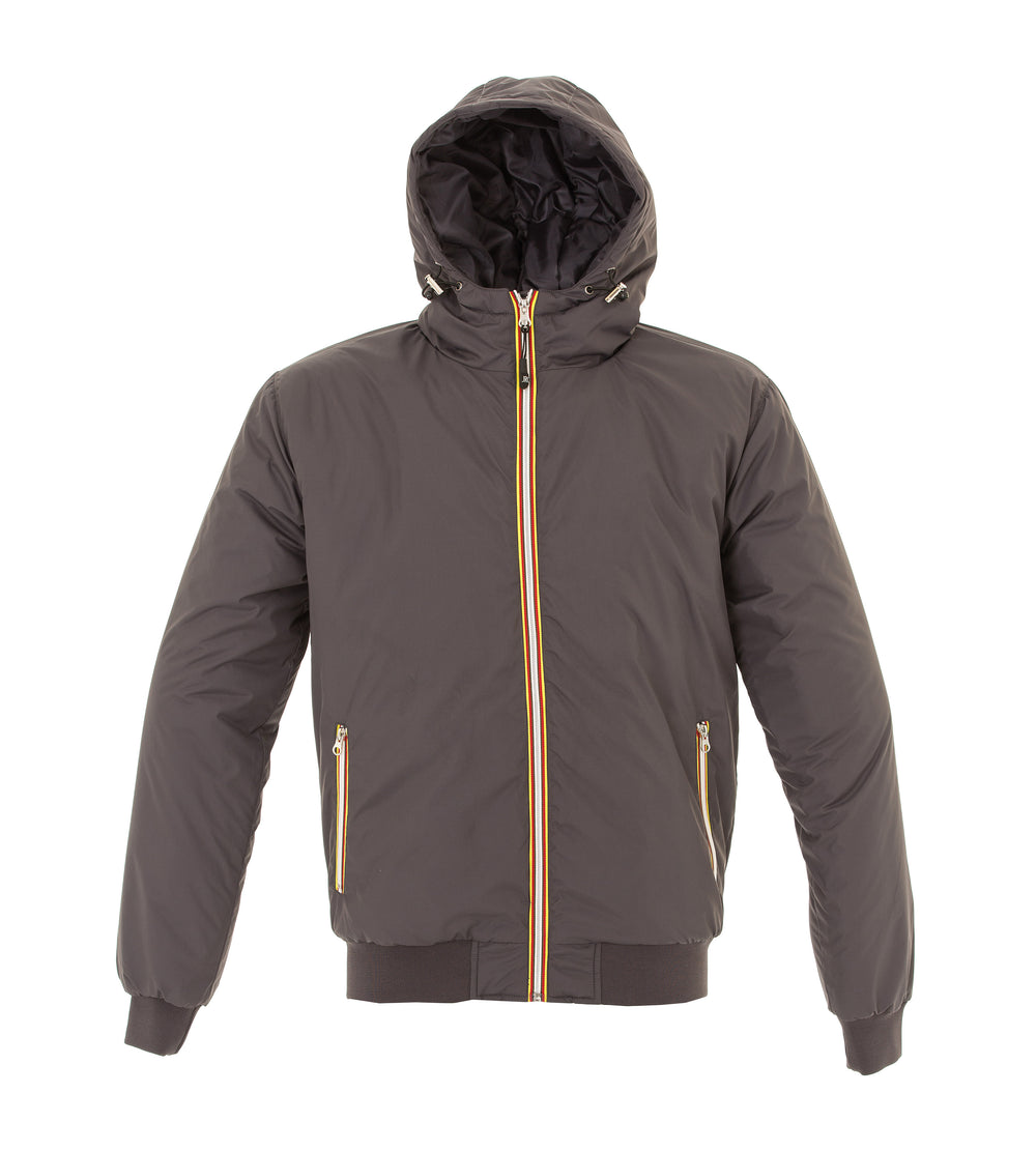 Giubbino in nylon 20D morbido, lucido e impermeabile - Fodera in poliestere, imbottitura in poliestere, cerniera Gialla/Rossa/Nera, cappuccio imbottito con chiusura regolabile con coulisse. Due tasche con zip esterne, due tasche interne con velcro, tessuto a protezione del mento, polsini e fondo in maglia elasticizzata.