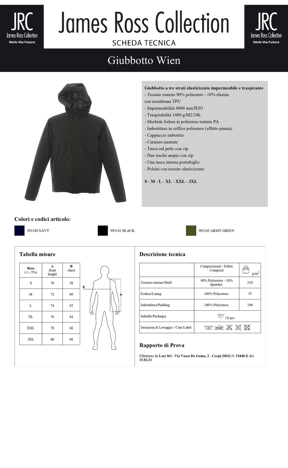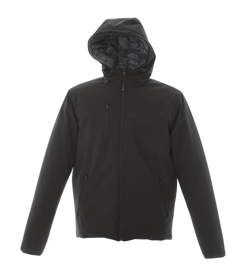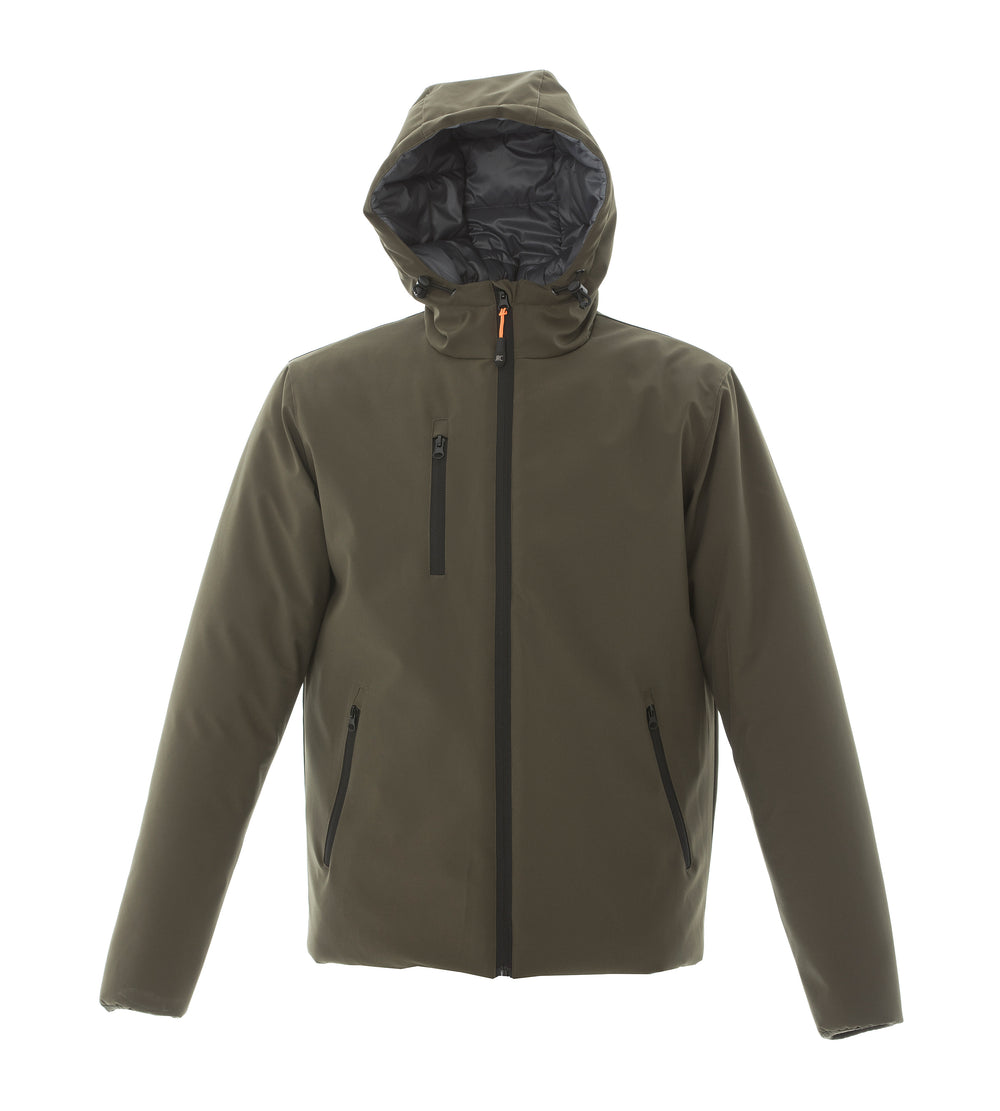 Giubbotto a tre strati elasticizzato impermeabile e traspirante - Tessuto esterno 90% polyestere - 10% spandex con membrana TPU - Impermeabilità 4000 mm/HO - Traspirabilità 1000 g/M2/24h. Morbida fodera in polyestere trattata PA, imbottitura in soffice polyestere (effetto piuma), cappuccio imbottito, cerniere nastrate, tasca sul petto con zip, due tasche ampie con zip e una tasca interna portafoglio, polsini con tessuto elasticizzato.