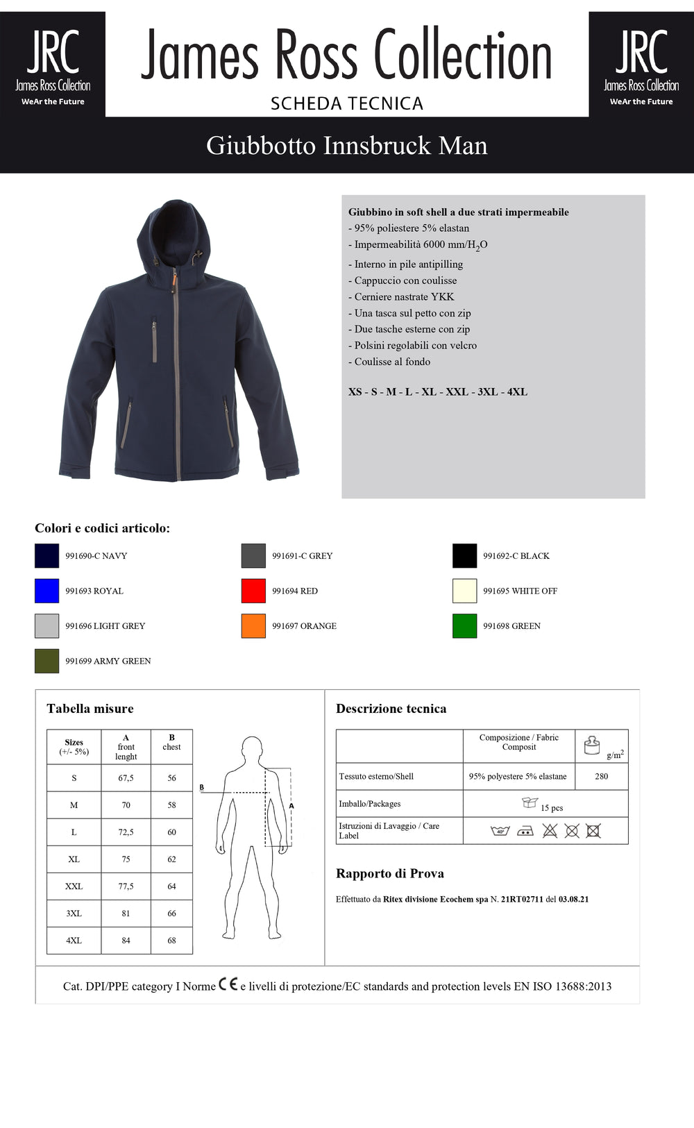 Composizione: Impermeabile fino a 6000 mm/HO, 95% Poliestere, 5% Elastan