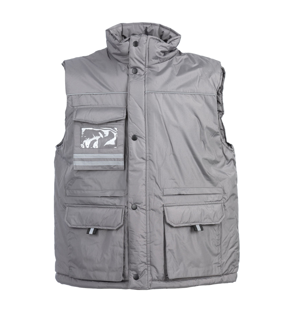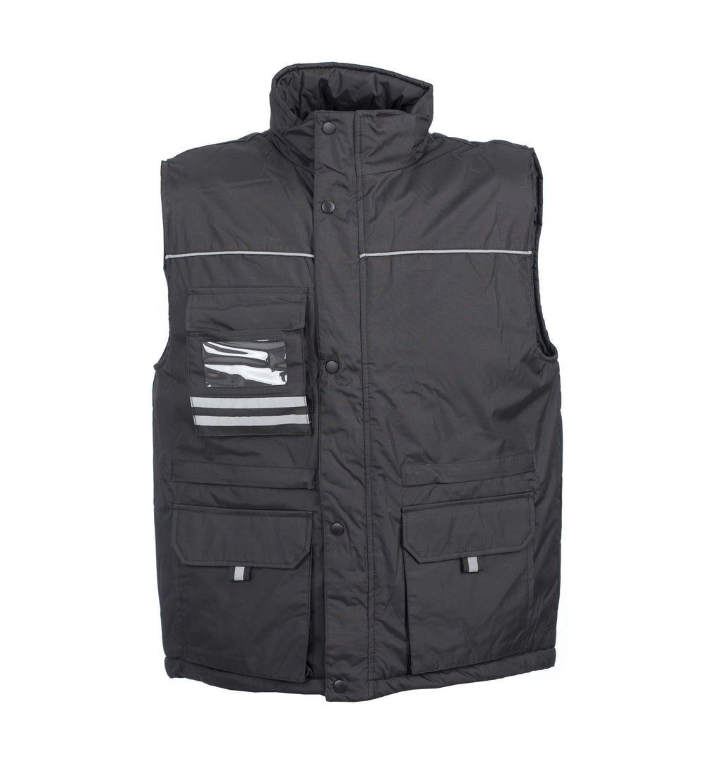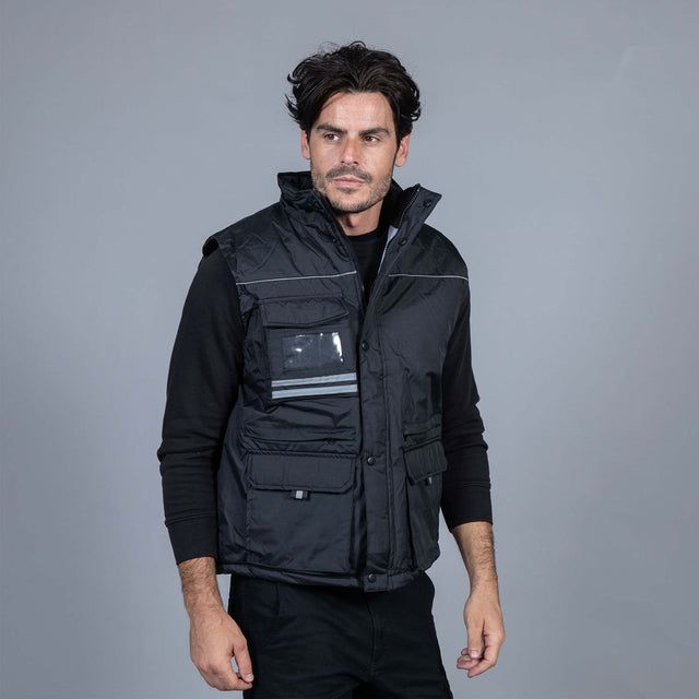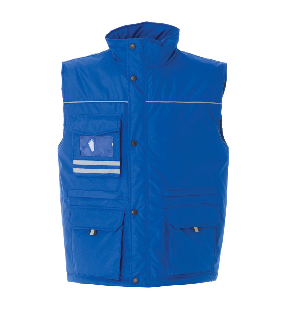 Gilet in nylon ripstop - Imbottitura in poliestere, fodera in poliestere, profili rifrangenti. Tasca sul petto con portabadge a scomparsa, due doppie tasche con patta e chiusura in velcro, due tasche con zip coperte e fodera rinforzata per utensili e tasca interna portafoglio. Elastico antivento nel giromanica, coulisse al fondo e una zip interna per personalizzare su schiena e una per il cuore.