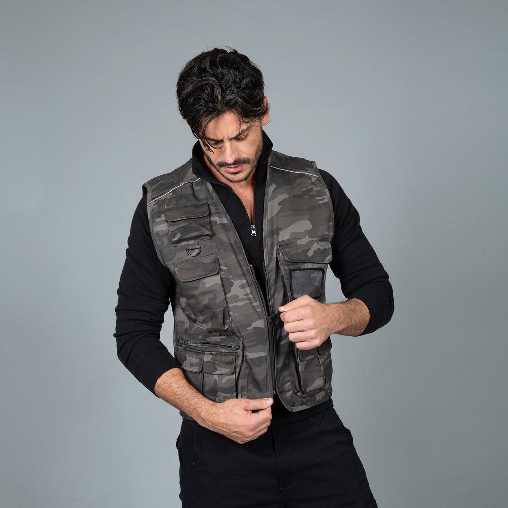 Gilet multitasche 65% poliestere - 35% cotone - Fodera retinata nella parte superiore sollevabile per facilitare personalizzazioni, tasca portabadge a scomparsa, NOVE tasche sul davanti chiudibili mediante zip o velcro e profili rifrangenti.