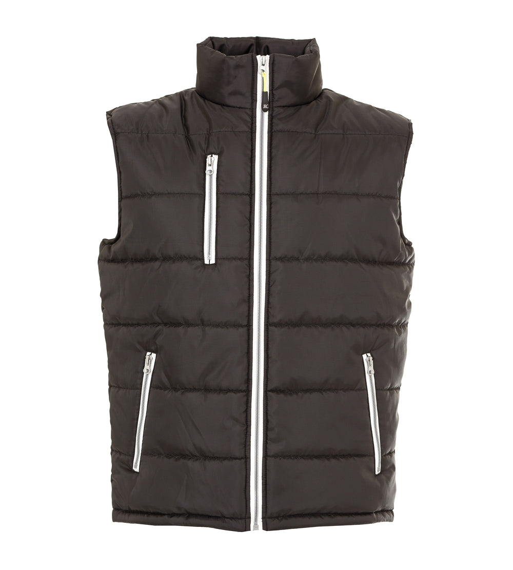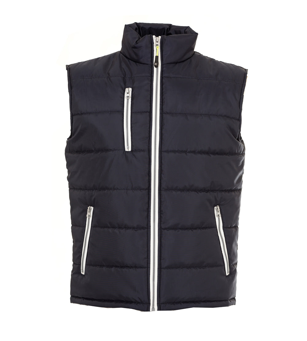 Gilet in nylon lucido impermeabile - Fodera in poliestere, imbottitura in poliestere, una tasca con zip sul petto, due tasche con zip e una tasca interna portafoglio.