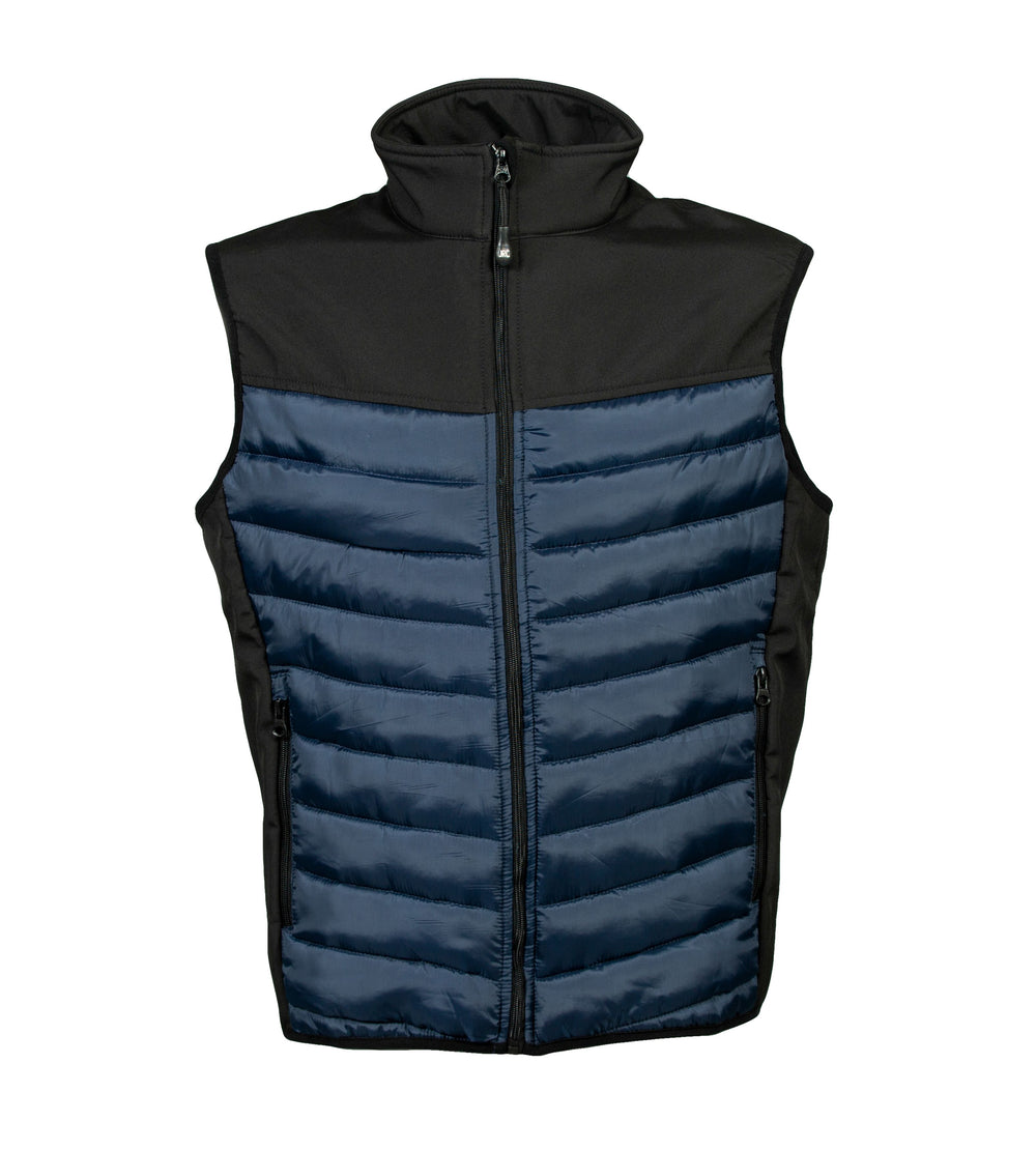 Gilet in tessuto composito - Corpo in 100% poliestere 300 T cire con imbottitura in soffice polyestere (effetto piuma) - Spalle, fianchi e parte superiore del busto in softshell a 2 strati, con interno in pile antipilling. Cerniere YKK, due tasche esterne con zip, tessuto a protezione del mento, tessuto elastico al giromanica, tessuto elastico al fondo.