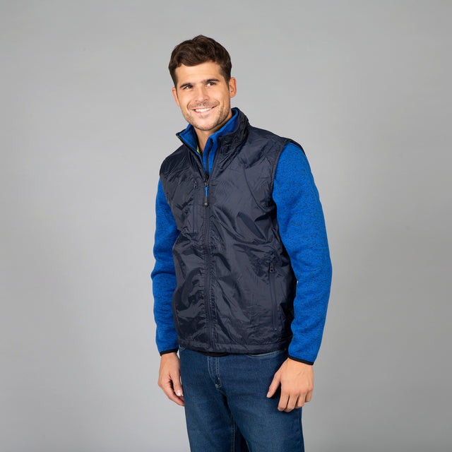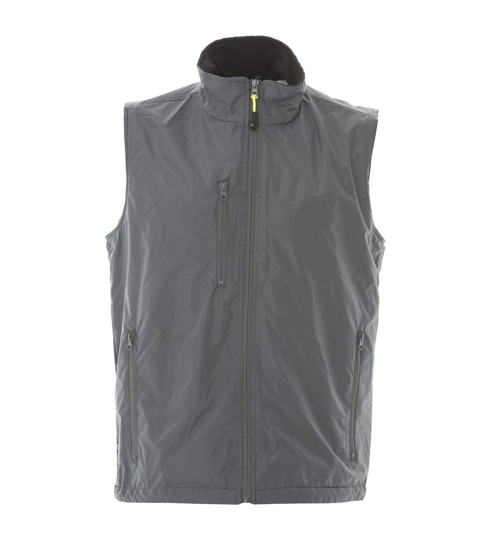 Gilet in poliestere pongee. Spalmatura in pvc impermeabile, fodera in pile antipilling, zip coperte antiacqua, una tasca con zip sul petto, due ampie tasche con zip e una tasca interna portafoglio con velcro, coulisse al fondo.