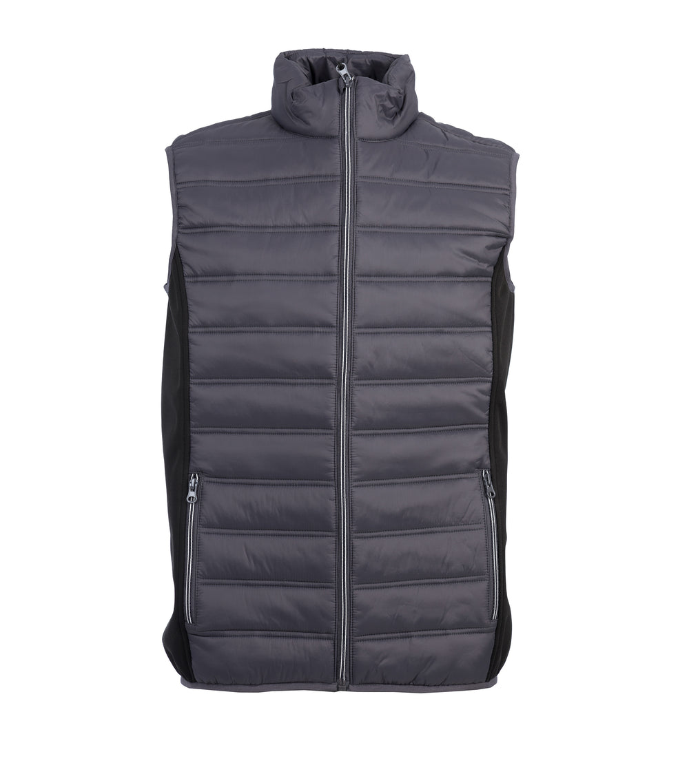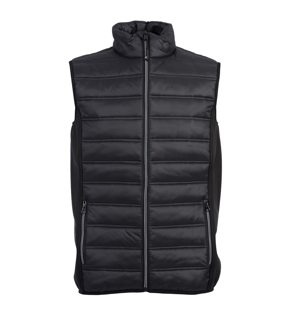 Gilet in tessuto composito impermeabile e traspirante - Corpo: nylon 20 D water resistance con fodera in poliestere 300T - Imbottitura in soffice poliestere (effetto piuma) -Fianchi: softshell tre strati con membrana TPU, con interno in pile antipilling - Impermeabilità 3000 mm/H2O - Traspirabilità 1000 g/M2/24h. Cerniere con profilatura in contrasto, due tasche con zip, due tasche interne, tessuto elastico nel giromanica e tessuto elastico al fondo.