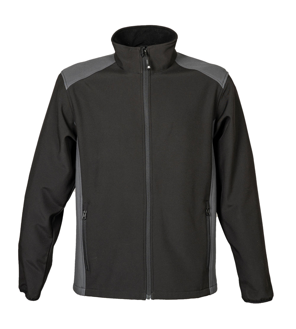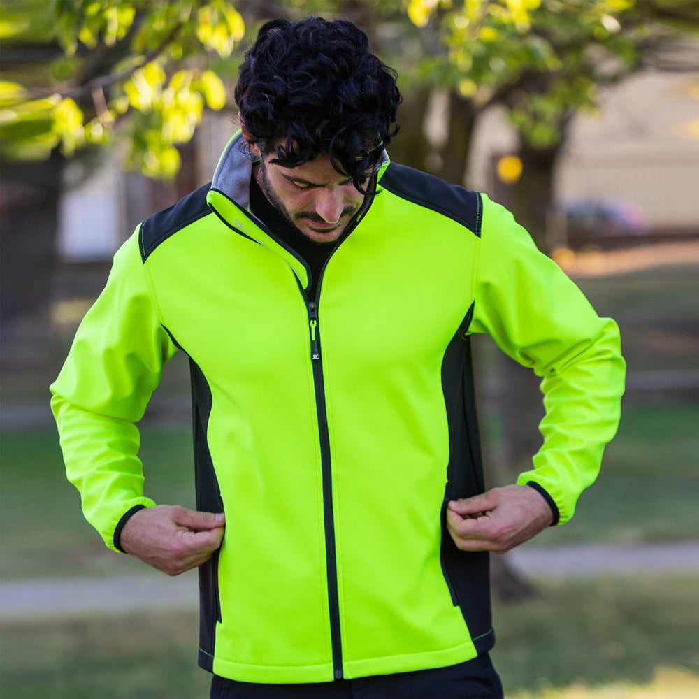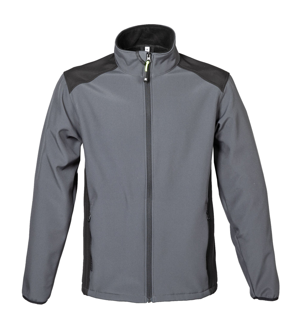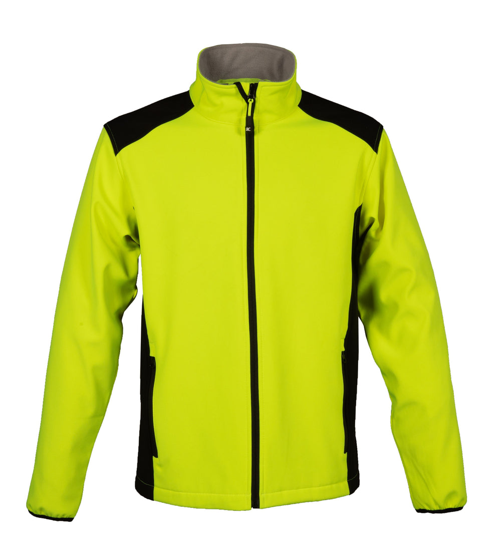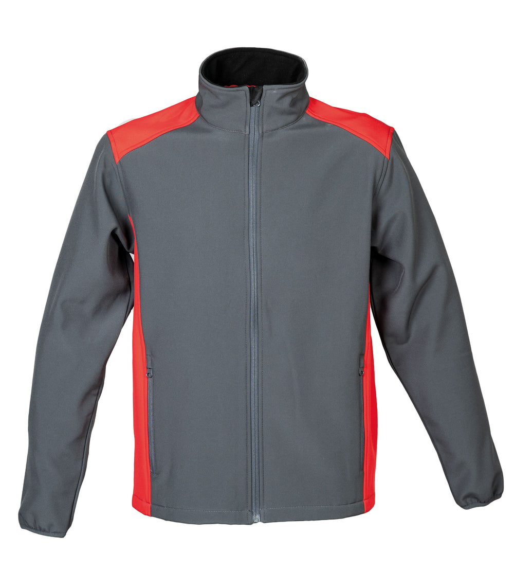 Giubbino bicolore in soft shell a due strati impermeabile - 100% poliestere stretch - Impermeabilità 6000 mm/H2O - No label, interno in pile, cerniere nastrate, cerniera centrale YKK, spalle e fianchi in contrasto. Tessuto a protezione del mento con stampa rifrangente, due tasche esterne con zip, polsini in tessuto elastico.