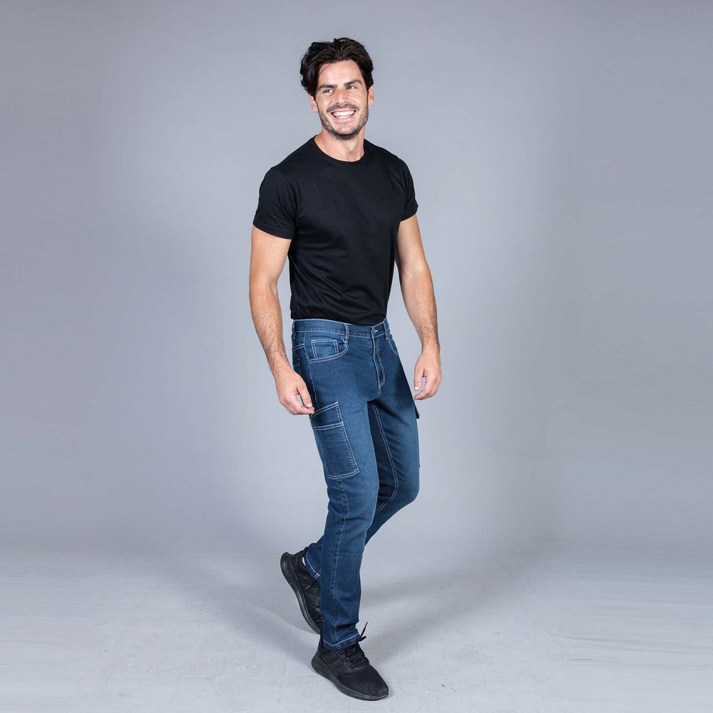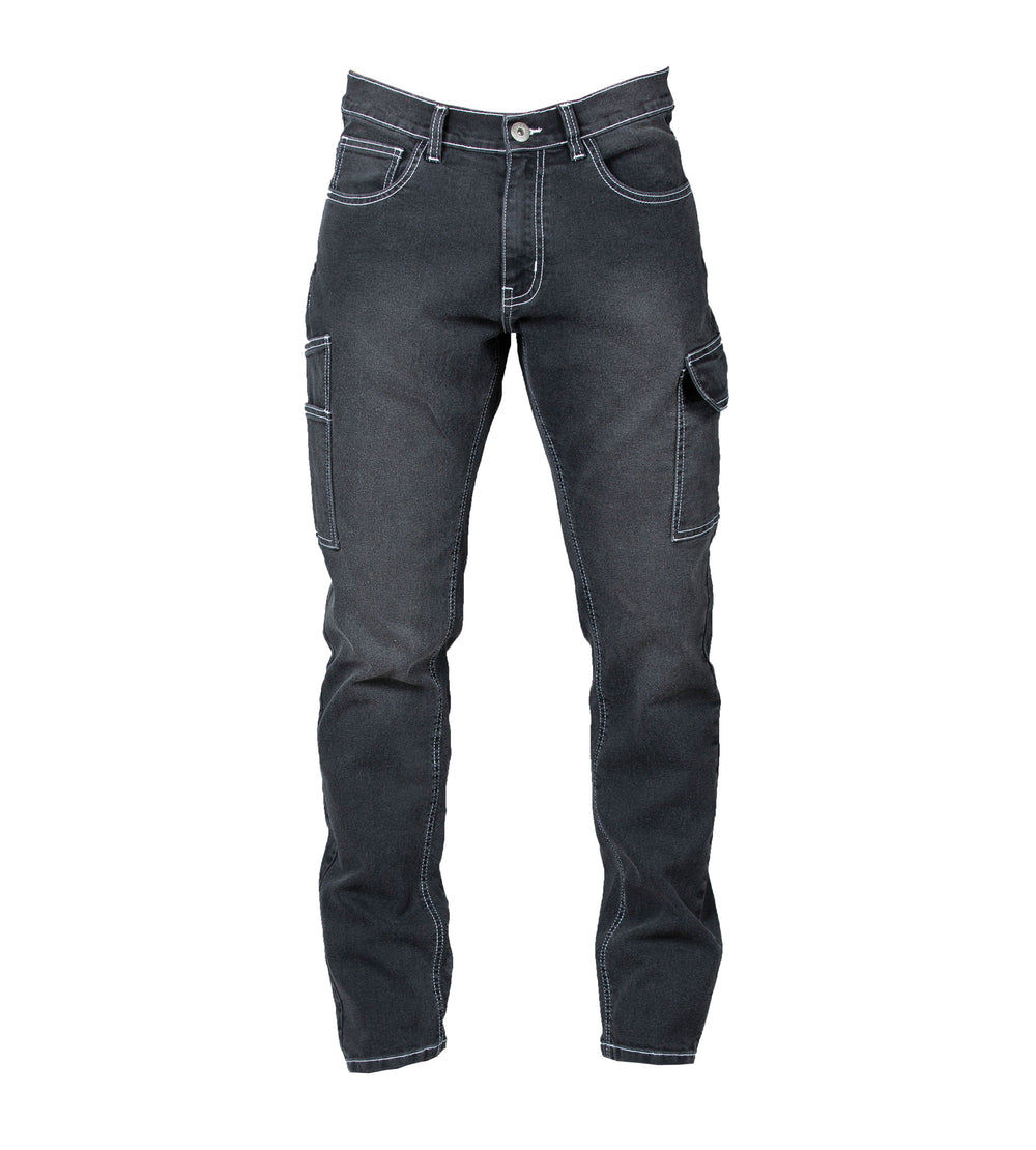 Pantalone jeans multitasche elasticizzato 81% cotone 17% polyestere 2% elastane - Tessuto prelavato, (elastici in vita sui fianchi solo per la tg. 58/60). Due tasche anteriori con taschino portamoneta, una tasca laterale con chiusura con velcro, doppia tasca laterale portautensili o portametro e due tasche posteriori