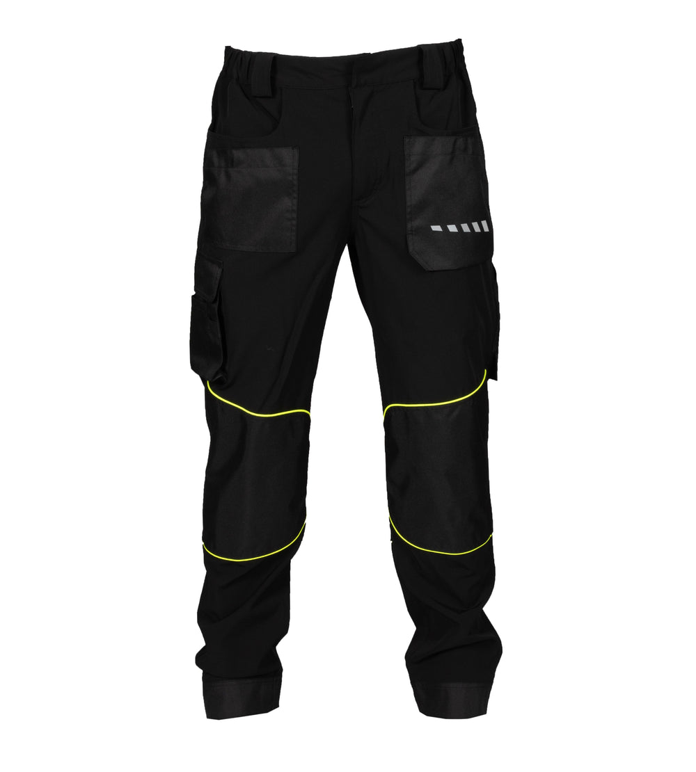 PANTALONE IMPERMEABILE IN TESSUTO ELASTICIZZATO IN ORIZZONTALE E VERTICALE PER IL MASSIMO COMFORT - 90% polyestere – 10% elastan - Tessuto di rinforzo color nero, in nylon 400D antistrappo - Impermeabilità 8000 mm/H2O. Stampe rifrangenti anteriori e posteriori, due tasche anteriori, due tasche applicate in tessuto antistrappo con bottoni automatici coperti, una tasca laterale in tessuto antistrappo con gancio estraibile portachiave o portabadge; doppio portapenne e passante porta utensile, doppia tasca posteriore portametro e portautensili in tessuto antistrappo e logo 4STRETCH e due tasche posteriori con velcro in tessuto antistrappo. Tessuto antistrappo sulle ginocchia con piping giallo fluo, tessuto antistrappo allungabile al fondo gamba, piping giallo fluo sulla tasca laterale e posteriore, elastici in vita e passanti maggiorati e bottone automatico in vita coperto. - Nessun elemento graffiante.