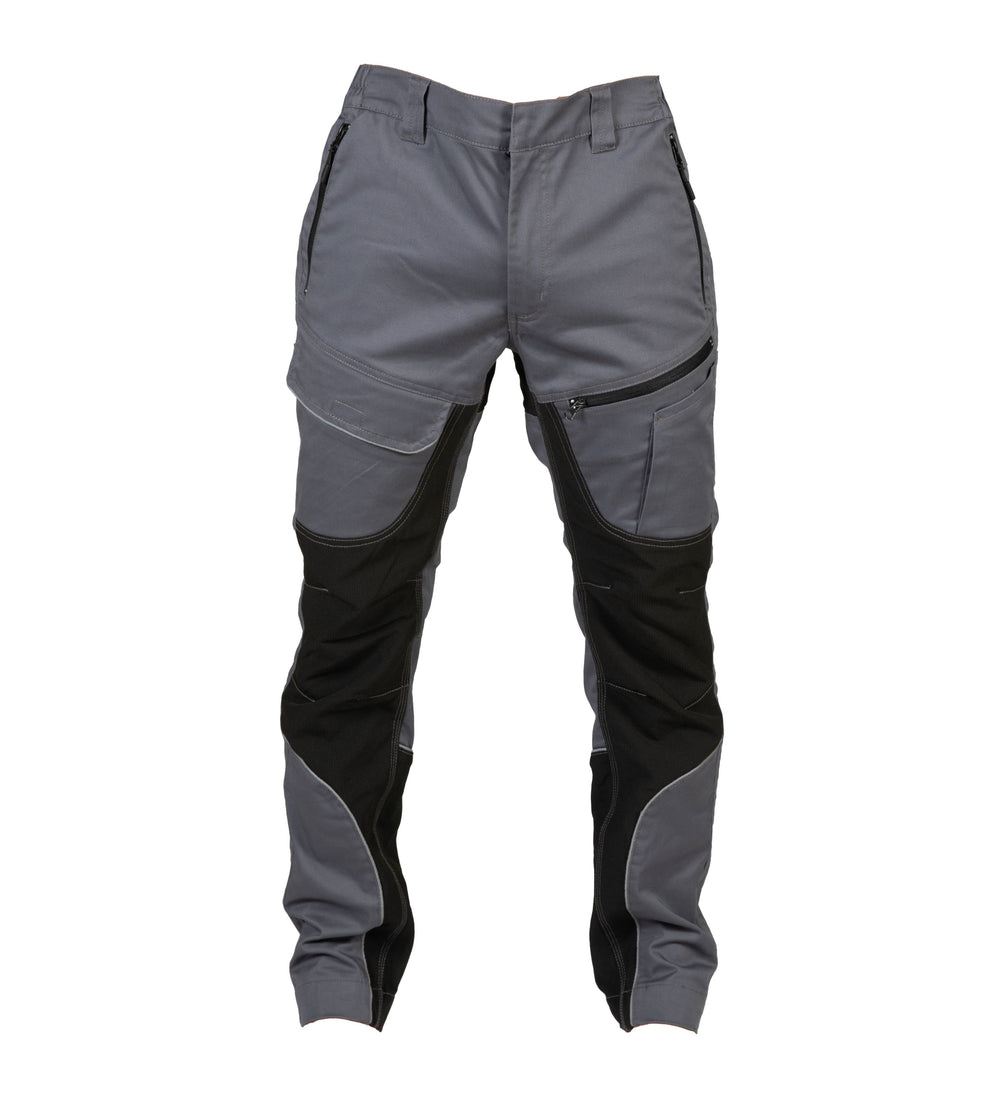 Tessuto principale in 65% polyestere - 33% cotone - 2% elastan – Tessuto secondario antiabrasione in 92% polyestere – 8% elastan su ginocchia, interno gamba e sedere. Dettagli rifrangenti, due tasche anteriori con zip, una tasca con velcro sulla coscia, una tasca con zip sulla coscia e un taschino aperto, una tasca portautensili o portametro posteriore e una tasca posteriore con zip. Elastici in vita sui fianchi e passanti maggiorati e bottone automatico in vita coperto.