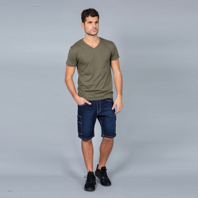 Pantalone corto multitasche in jeans elasticizzato 81% cotone 17% poliestere 2% elastan. Tessuto prelavato, elastici in vita sui fianchi solo per la tg. 58/60. Due tasche anteriori con taschino portamoneta, una tasca laterale con chiusura con velcro, doppia tasca laterale portautensili o portametro e due tasche posteriori