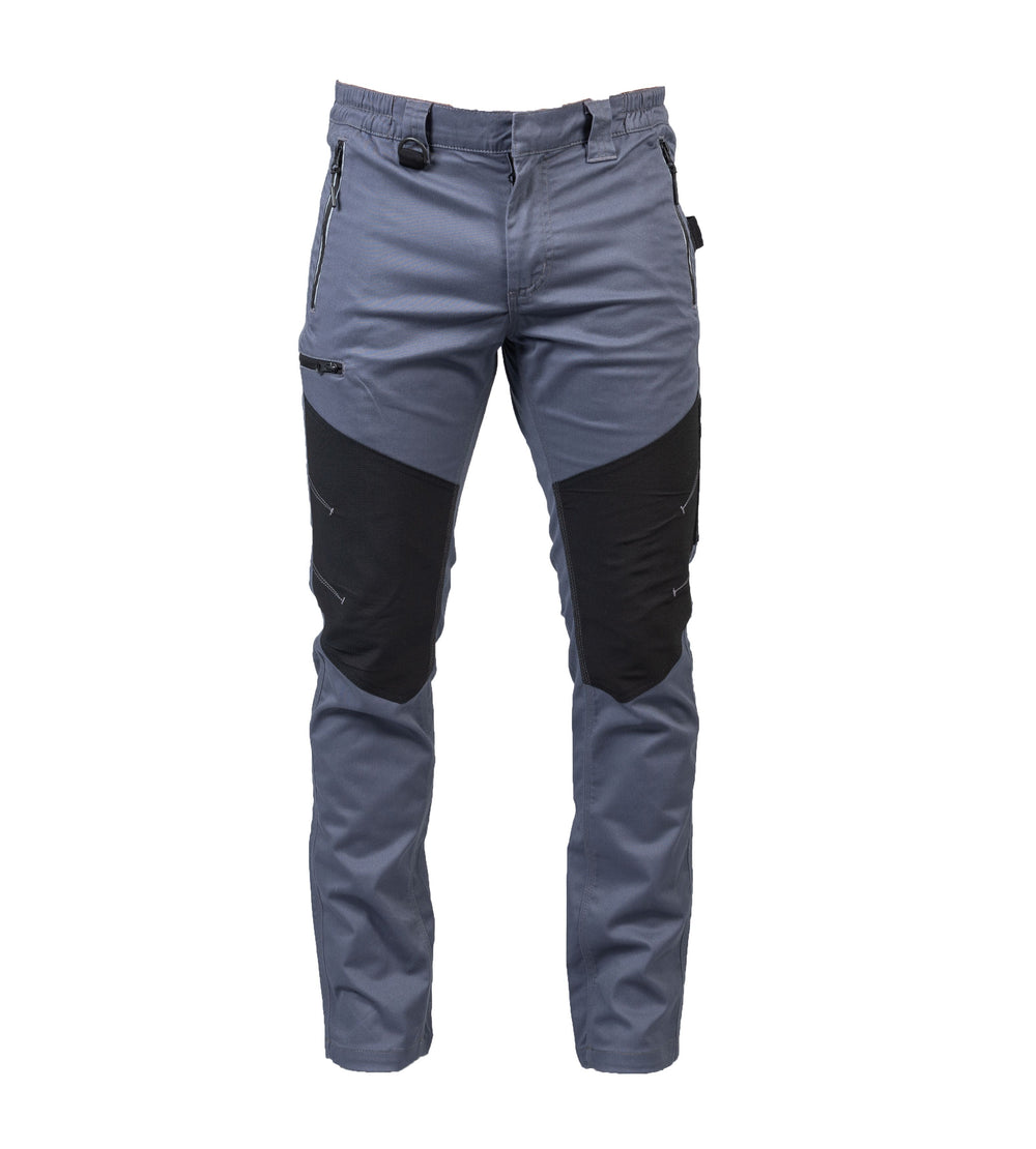 Pantalone multitasche elasticizzato - Tessuto principale in 65% poliestere - 33% cotone - 2% elastan - Tessuto antiabrasione elasticizzato 92% poliestere - 8% elastan sulle ginocchia con impunture in contrasto. triple cuciture, Due tasche anteriori con zip con nastratura rifrangente, una tasca laterale con zip, una tasca posteriore aperta, una tasca posteriore con zip con nastratura rifrangente e doppia tasca laterale portautensili o portametro. Gancio portamartello, elastici in vita sui fianchi e passanti maggiorati, gancio portachiavi o portabadge in pvc, bottone automatico in vita coperto.