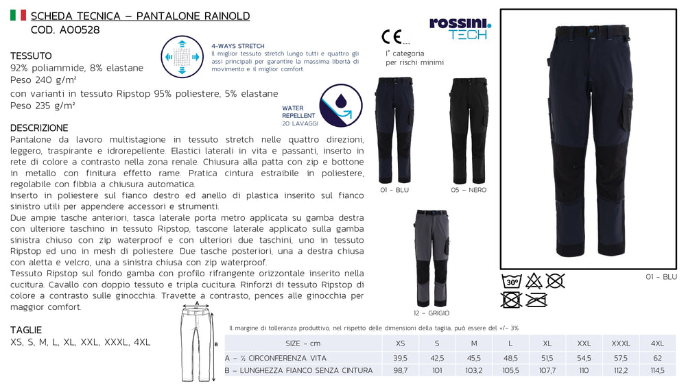 PANTALONE DA LAVORO MULTITASCHE ELASTICIZZATO RAINOLD A00528 ROSSINI TECH UOMO