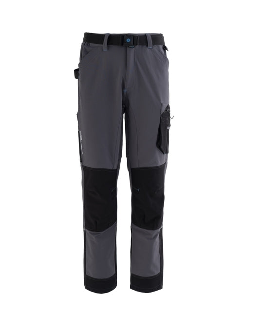 Pantalone da lavoro multistagione in tessuto stretch nelle quattro direzioni, leggero e traspirante, elastici laterali in vita e passanti, inserto in rete di colore a contrasto nella zona renale. Chiusura alla patta con zip e bottone in metallo con finitura effetto rame. Pratica cintura estraibile in poliestere, regolabile con chiusura a chiusura automatica.