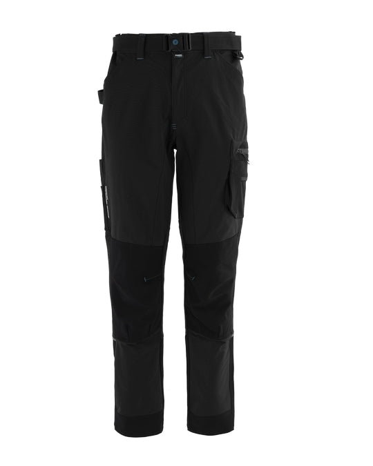 Tessuto Ripstop sul fondo gamba con profilo rifrangente orizzontale inserito nella cucitura. Cavallo con doppio tessuto e tripla cucitura. Rinforzi di tessuto Ripstop di colore a contrasto sulle ginocchia. Travette a contrasto, pences alle ginocchia per maggior comfort.