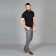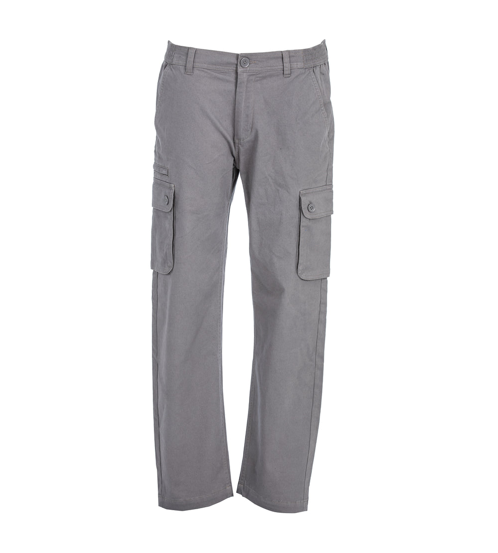 Pantalone elesticizzato multitasche - 98% cotone – 2% elastan - Tessuto prelavato, due tasche anteriori, due tasche laterali con bottoni, una tasca laterale con zip coperta e due tasche posteriori con bottoni.