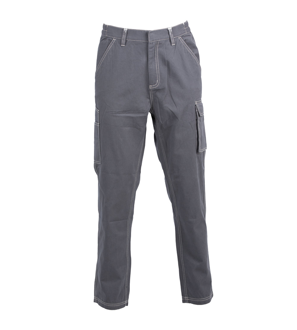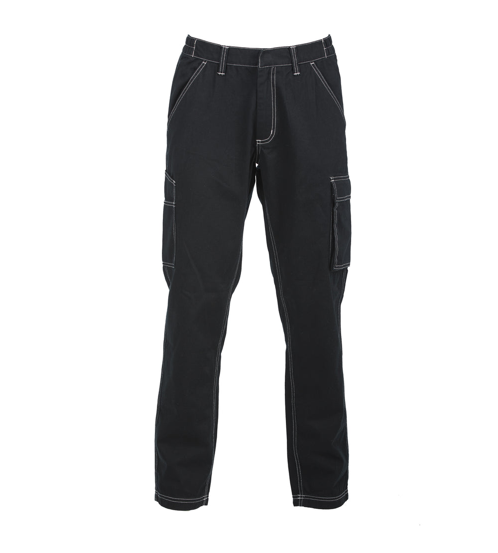 Pantalone da uomo multitasche 100% cotone - Tessuto prelavato. Cuciture in contrasto, elastici in vita e sui fianchi, due tasche anteriori, una tasca laterale a soffietto con velcro, doppia tasca laterale portautensili o portametro e una tasca posteriore con velcro, bottone automatico in vita coperto. - Nessun elemento graffiante.