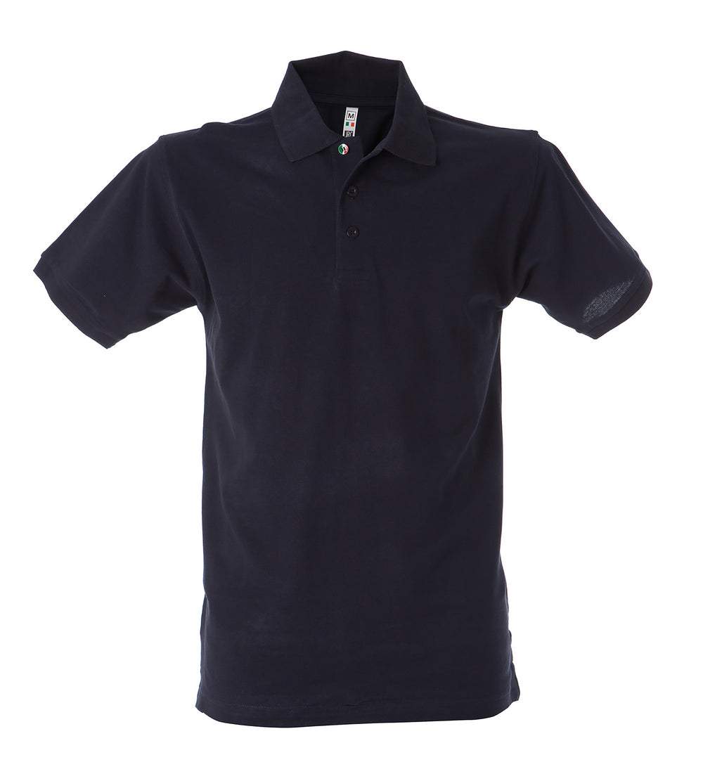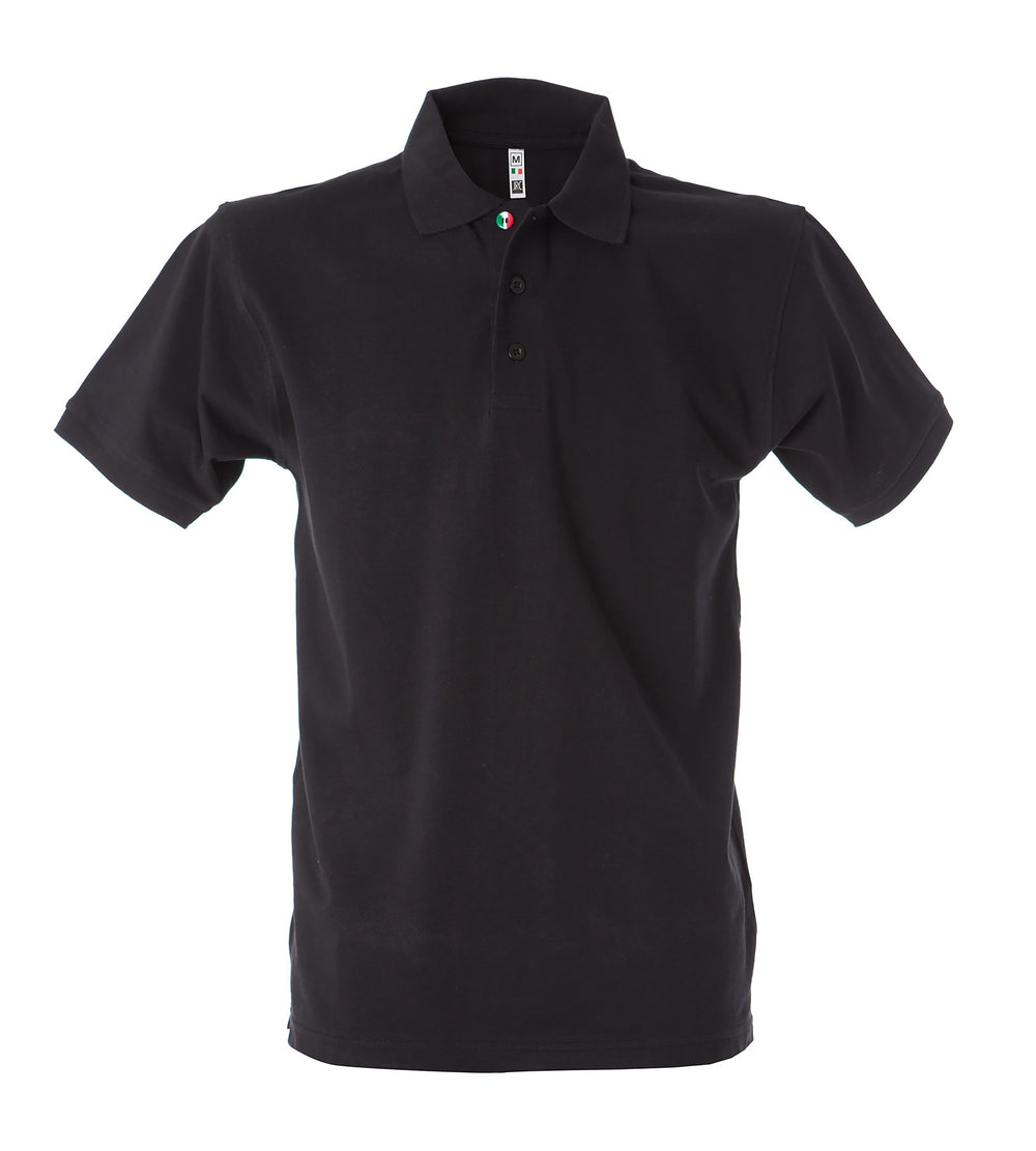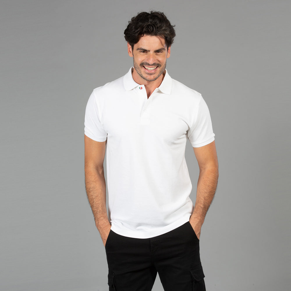 Polo manica corta - 100% cotone piqué pettinato. Colletto e fondo manica in rib, bottoni in tinta e un bottone con tricolore italiano, un bottone addizionale in tinta, spacchetti laterali, nastro di rinforzo nell'interno collo, imbustate singolarmente.