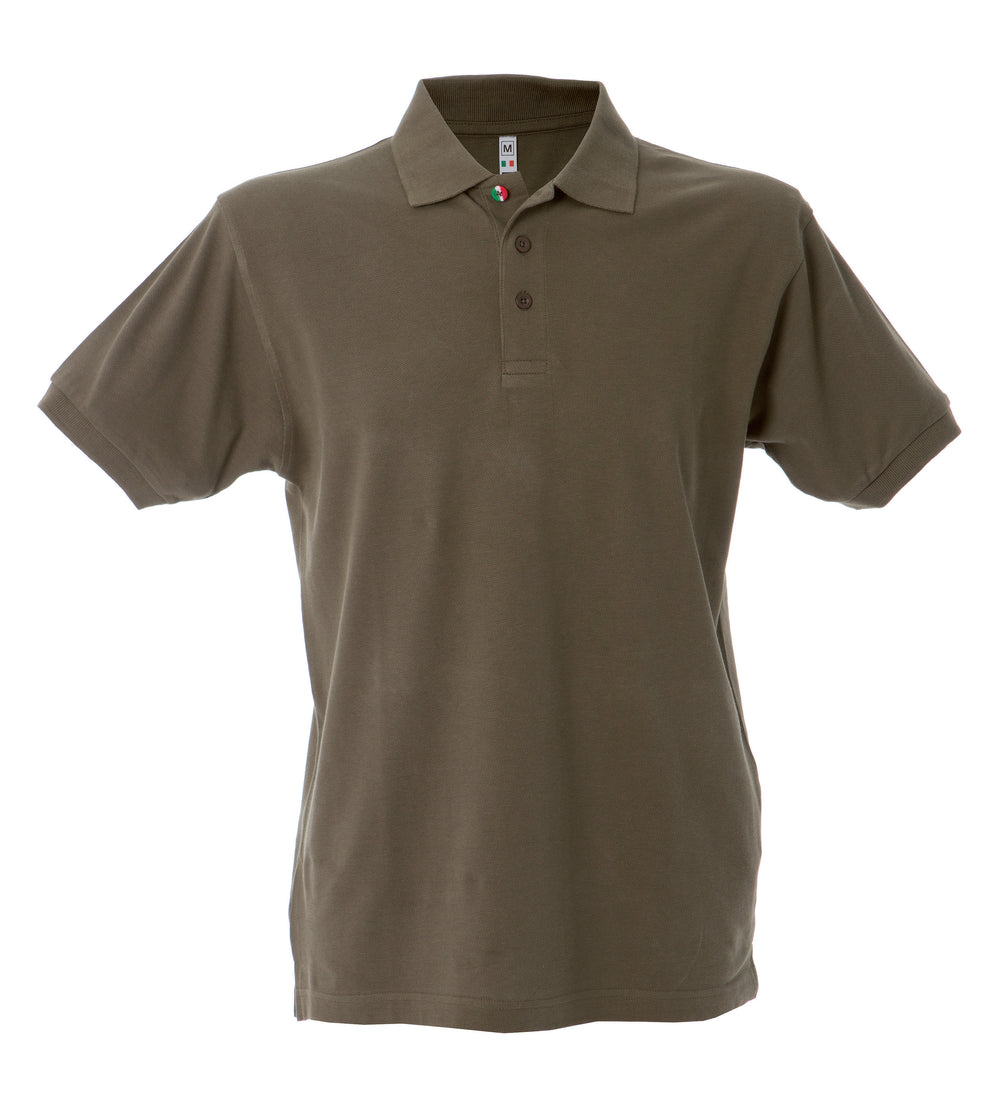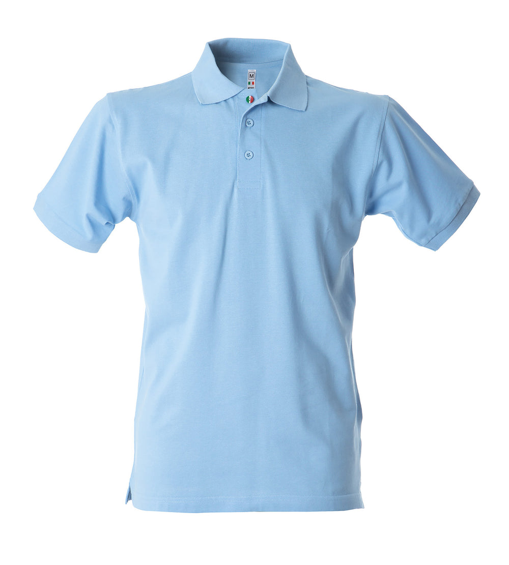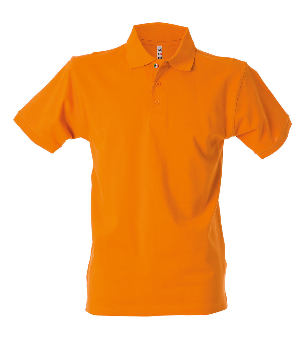 Polo manica corta - 100% cotone piqué pettinato. Colletto e fondo manica in rib, bottoni in tinta e un bottone con tricolore italiano, un bottone addizionale in tinta, spacchetti laterali, nastro di rinforzo nell'interno collo, imbustate singolarmente.
